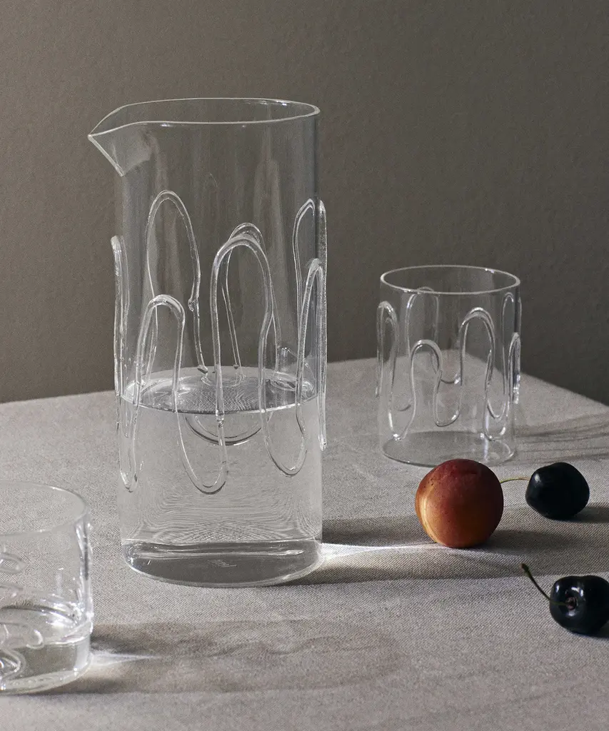 With each piece featuring a different, unique pattern, the Doodle Carafe makes an artful addition to any glassware collection. Made entirely from durable borosilicate glass, its distinctive, wavy patterns are crafted by an experienced glass master using a torch, ensuring that no two pieces are identical. The clear glass provides the Doodle Carafe with a clean, modern look, while the wavy design grants it a distinctive, whimsical expression.Designed and produced by the Copenhagen-based studio Ferm Living.