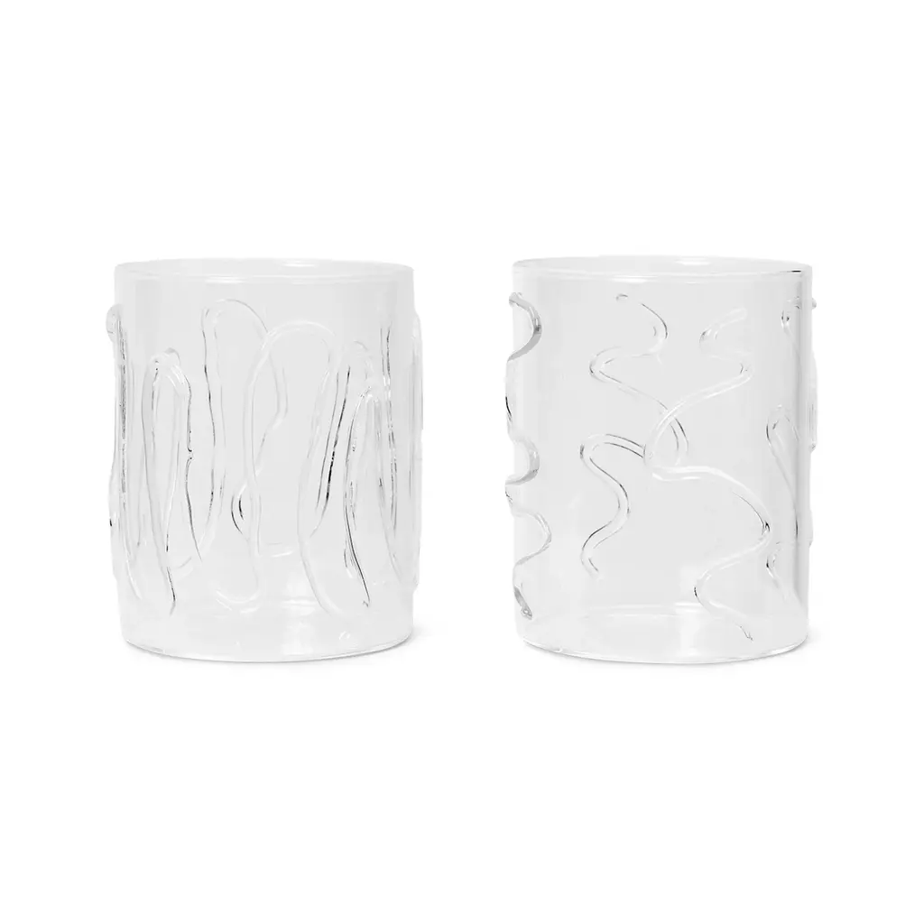 With each set featuring two different, unique patterns, the Doodle Glasses make an artful addition to any glassware collection. Made entirely from durable borosilicate glass, the distinctive, wavy patterns are crafted by an experienced glassmaker using a torch, ensuring that no two pieces are exactly identical. The clear glass provides the Doodle Glasses with a clean, modern look, while the wavy designs grant them a distinctive, whimsical expression. The set of two is packed in a lovely, reusable wooden box, making it ideal for gifting. Features