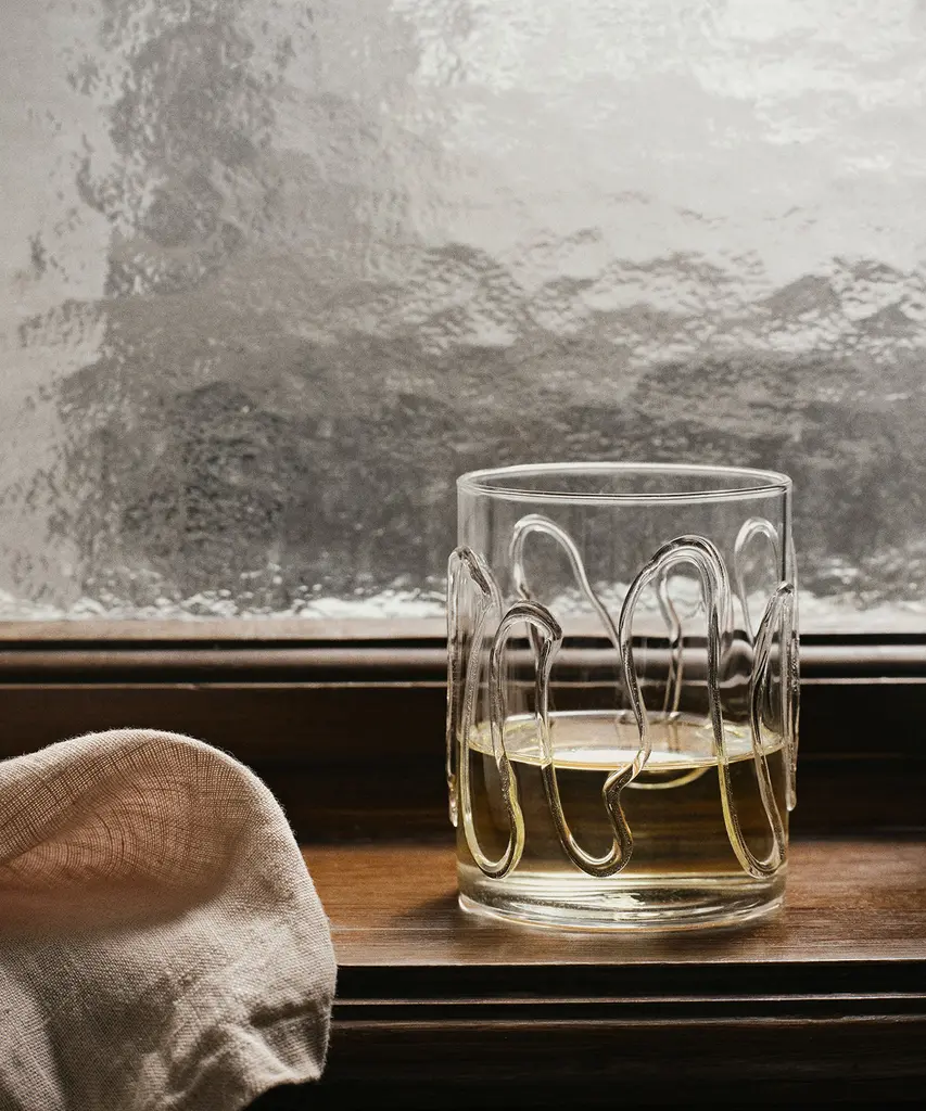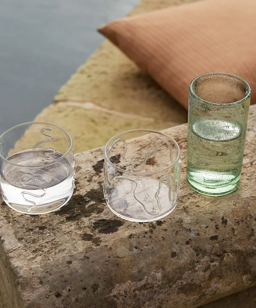 With each glass featuring a different, unique pattern, the Doodle Glasses make an artful addition to any glassware collection. Made entirely from durable borosilicate glass, the distinctive, wavy patterns are crafted by an experienced glass master using a torch, ensuring that no two pieces are identical. The clear glass provides the Doodle Glasses with a clean, modern look, while the wavy designs grant them a distinctive, whimsical expression. The set of two is packed in a lovely, reusable wooden box, making it ideal for gifting.Designed and produced by the Copenhagen-based studio Ferm Living.