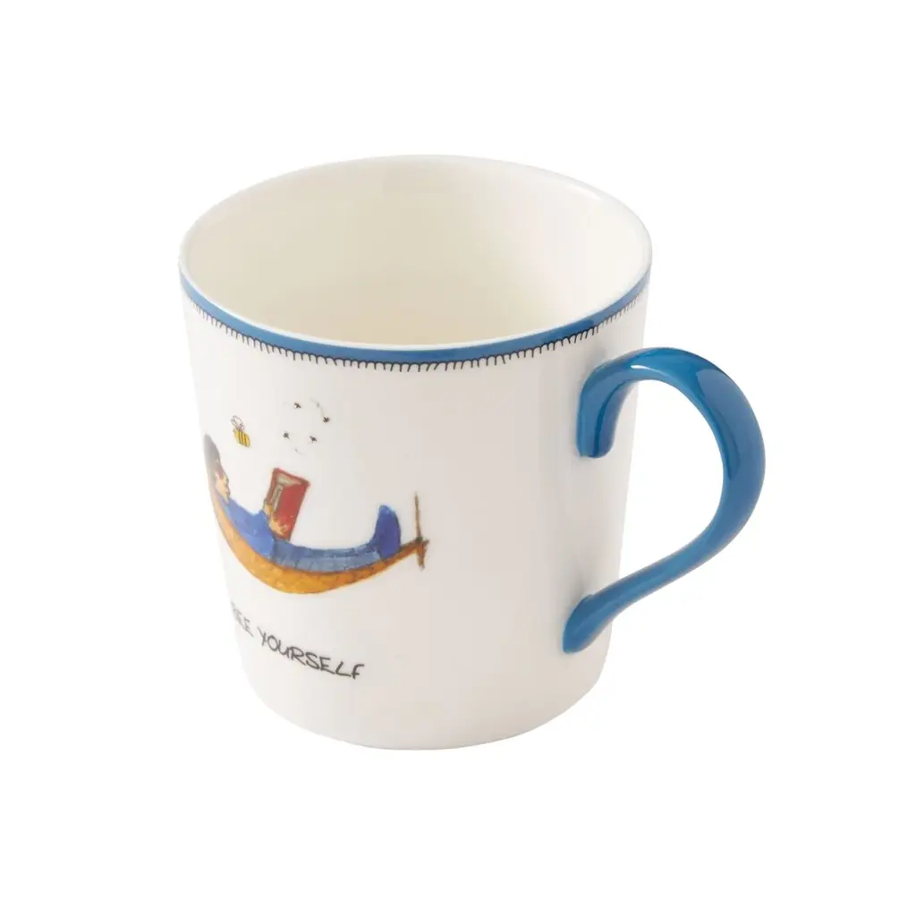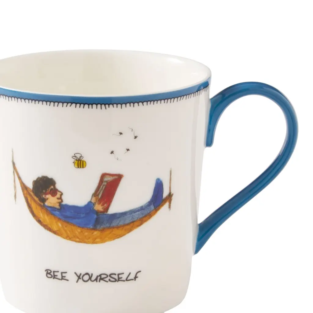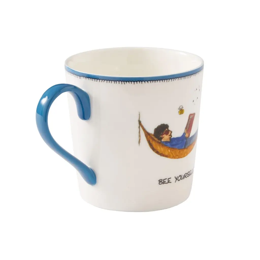 A unique gift, this fine china mug is sure to raise a smile. A playful illustration, painted by Willow Kemp, of a bee buzzing above someone relaxing on a hammock adorns either side of the cup above the tagline ‘Bee Yourself’. Striking blue surrounds the outer rim of the mug and a matching blue handle finishes the piece off beautifully. Packaged in a colourful green and blue gift box, this mug is the perfect gift to show someone you care a little encouragement.