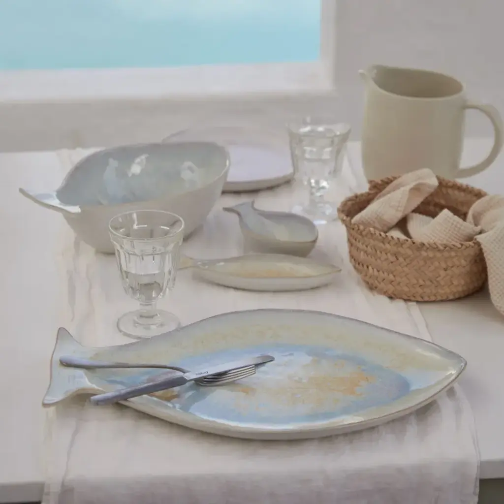 With two beautiful glazes inspired by the blue shades of the Atlantic Ocean and the natural colors of beach shells, the Dori collection is all about happy, carefree summer days. It features fish-shaped serveware and appetizer items that are both functional and decorative.