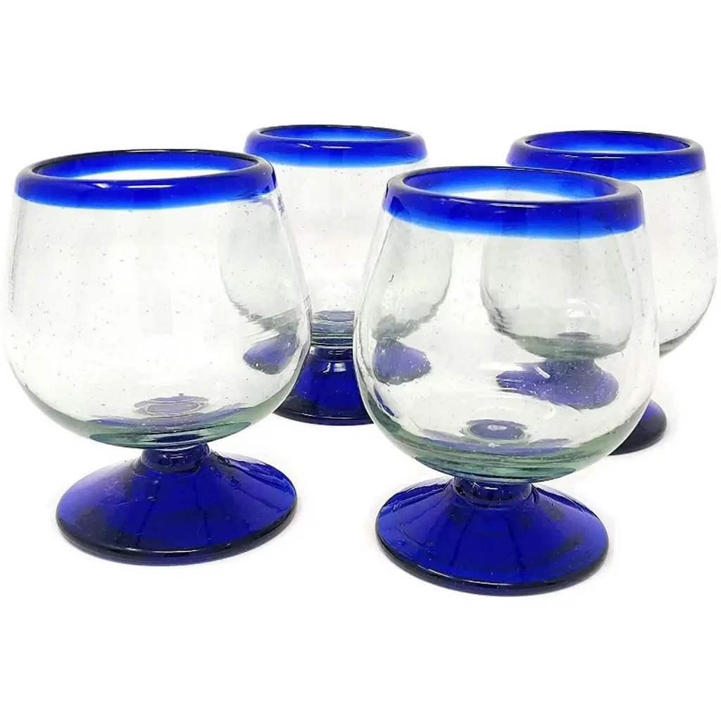 This set of 4 hand blown snifter/cognac/tequila glasses with cobalt blue rims is perfect for your next fiesta! Use them to serve tequila, cognac, or your drink of choice. The blue rimmed set adds a great sense of elegance to the dining room that will be enjoyed by everyone. Each blown glass may vary slightly in size and show tiny bubbles within the glass that develop from the blowing process. Lead-free, made from sustainable recycled glass. Handwashing recommended, but dishwasher safe on the top rack. Exceptional artisan quality, thick and sturdy glass. Proudly hand made in Mexico.