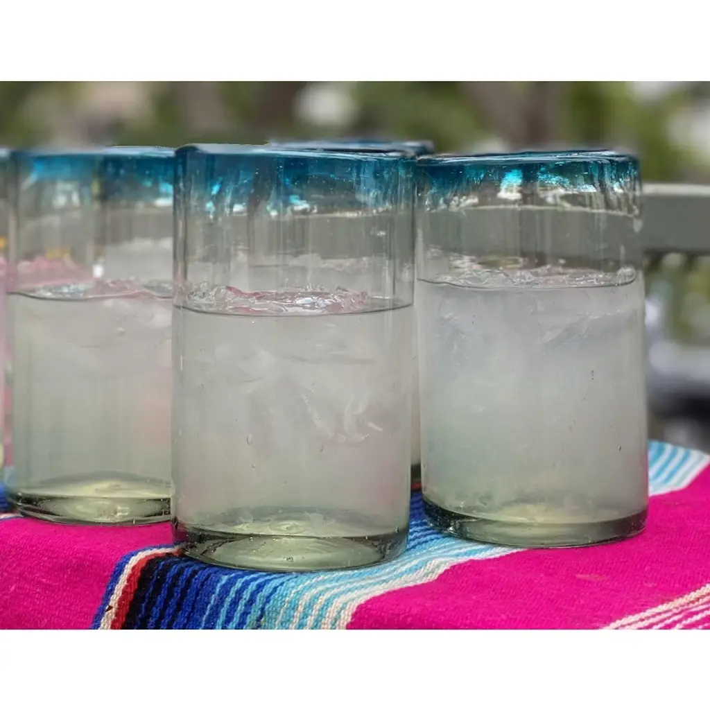 Dos Sueños Mexican Hand Blown Drinking Glasses - Aqua Rim - 14oz - Set Of 4