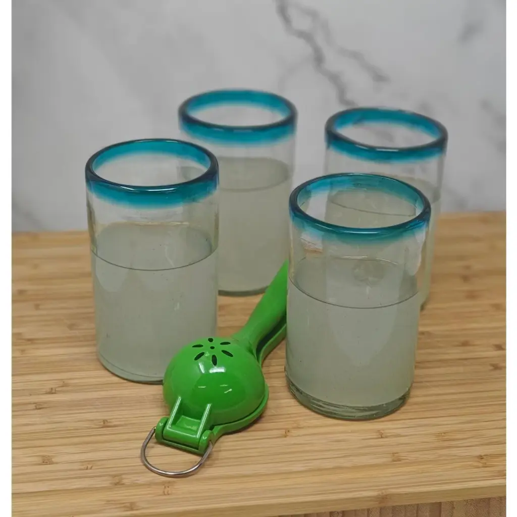 This traditional set of 4 hand blown drinking glasses with aqua rims is perfect for your next fiesta! Use them to serve water, juice, soda or alcohol. The set adds a great sense of elegance to the dining room that will be enjoyed by everyone. Lead-free, made from sustainable recycled glass. Hand-washing recommended, but dishwasher safe on the top rack. Exceptional artisan quality, thick and sturdy glass. Proudly hand made in Mexico.
