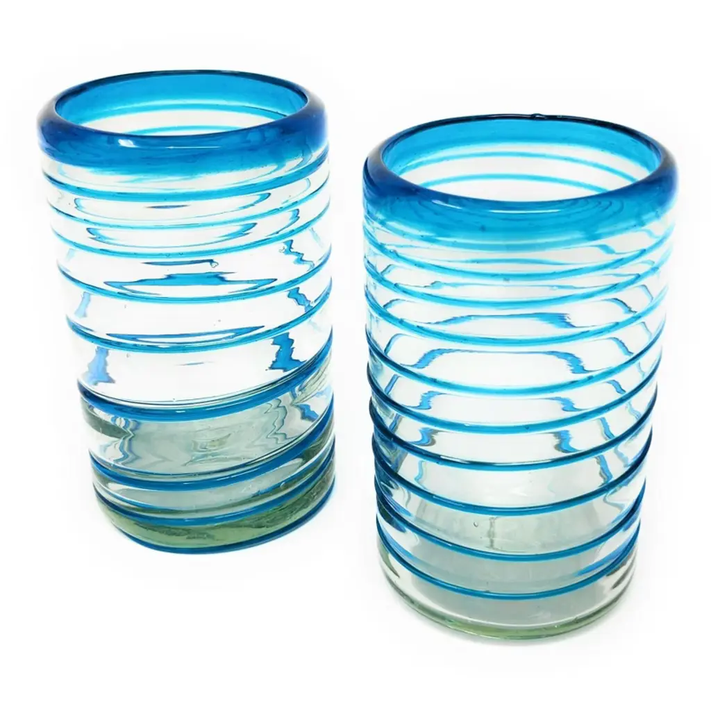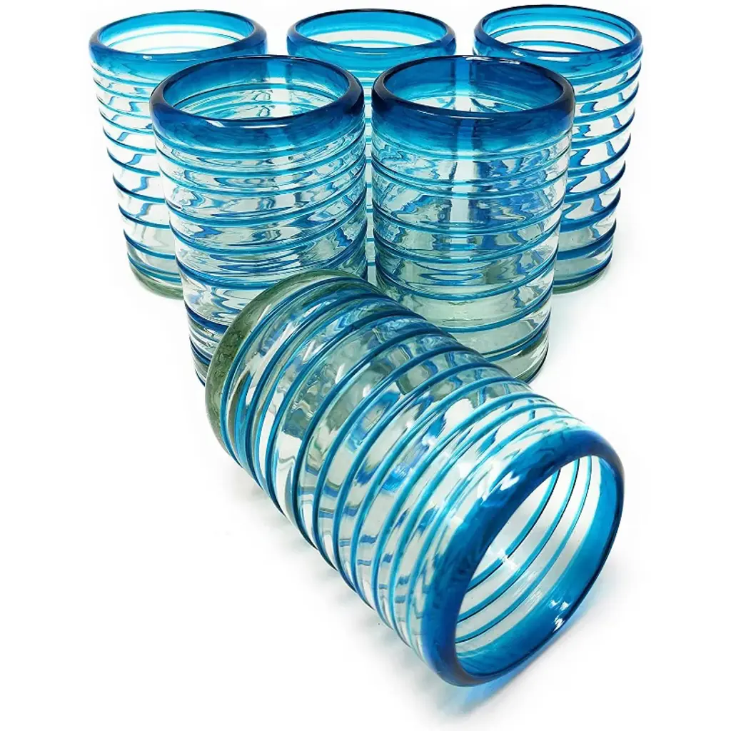 Dos Sueños Mexican Hand Blown Drinking Glasses - Aqua Spiral - 14oz - Set Of 6