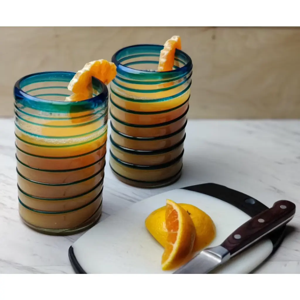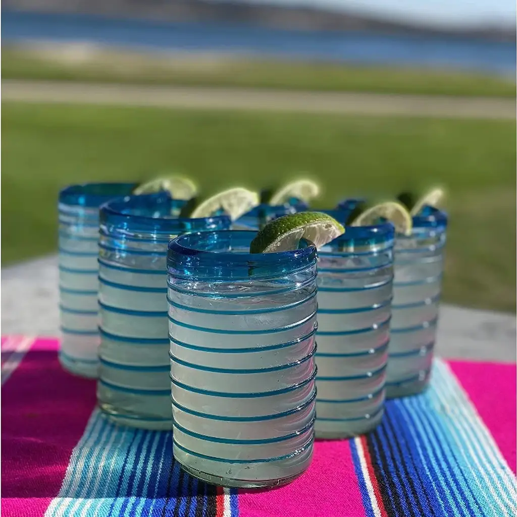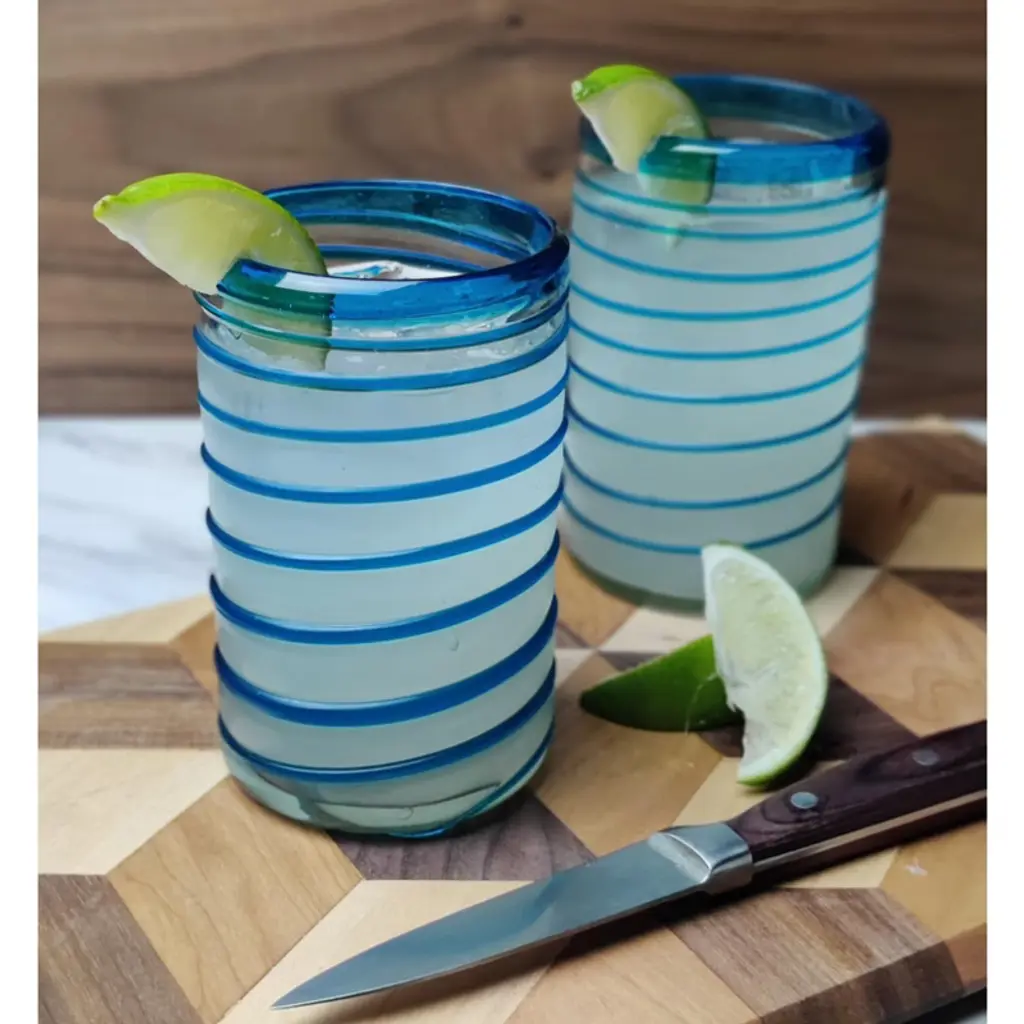 Enjoy your favorite cocktail or drink of choice in style at your next fiesta! Exceptional Artisan Quality. This traditional set of 6 aqua spiral drinking glasses is perfect for your next fiesta! Use them to serve water, juice, soda or alcohol. The set adds a great sense of elegance to the dining room that will be enjoyed by everyone. Each blown glass is made by the hands of skilled artisans, may vary slightly in size and show tiny bubbles within the glass that develop from the blowing process. Lead-free, made from sustainable recycled glass. Hand-washing recommended, but dishwasher safe on the top rack. Exceptional artisan quality, thick and sturdy glass. Proudly hand made in Mexico.