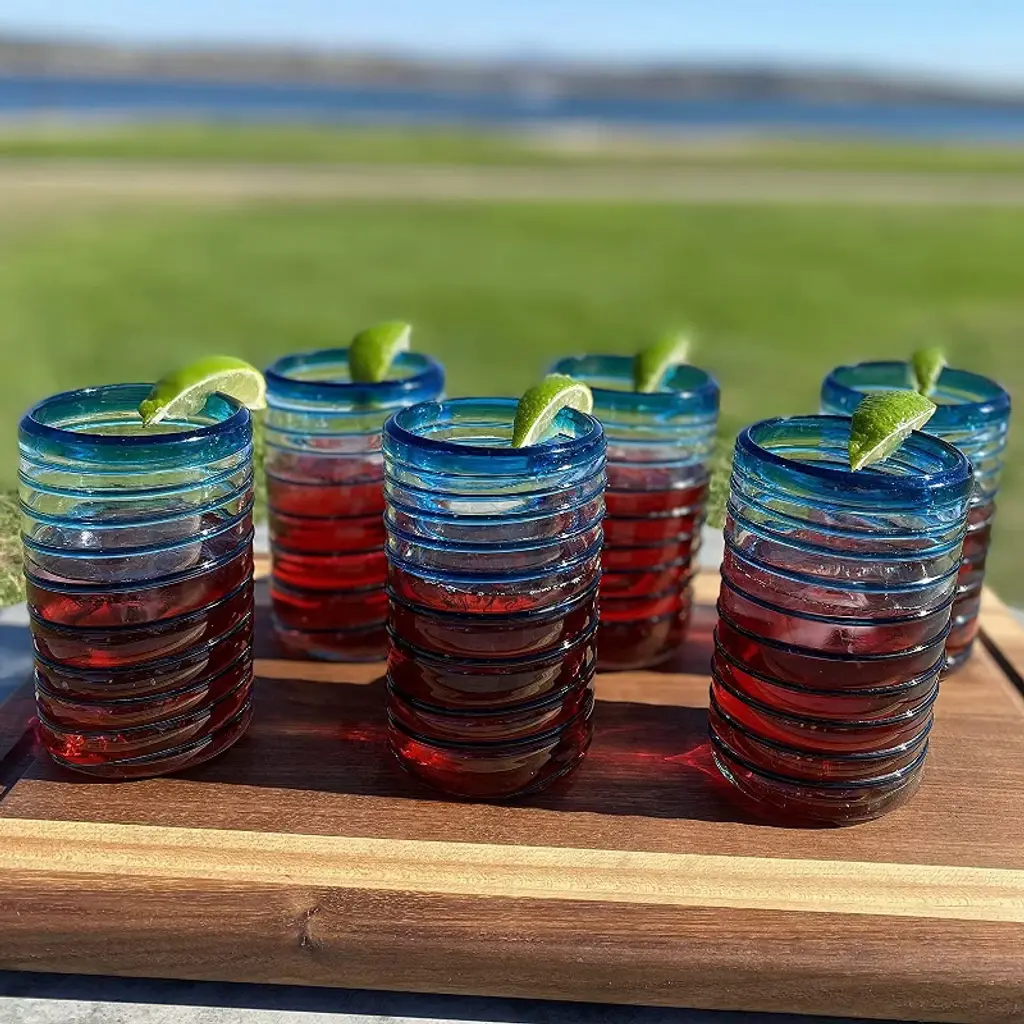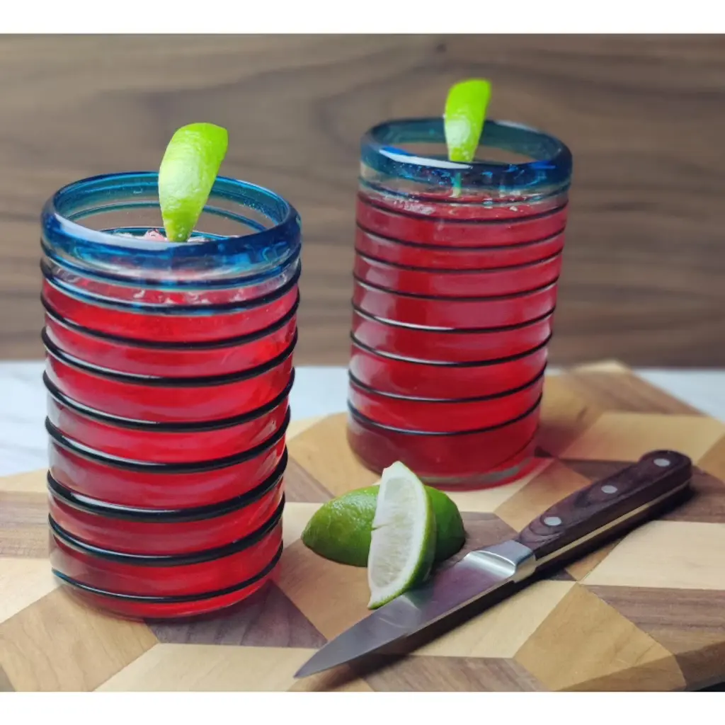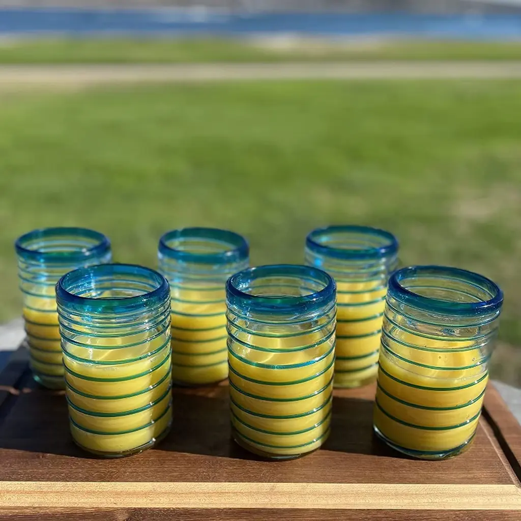Enjoy your favorite cocktail or drink of choice in style at your next fiesta! Exceptional Artisan Quality. This traditional set of 6 aqua spiral drinking glasses is perfect for your next fiesta! Use them to serve water, juice, soda or alcohol. The set adds a great sense of elegance to the dining room that will be enjoyed by everyone. Each blown glass is made by the hands of skilled artisans, may vary slightly in size and show tiny bubbles within the glass that develop from the blowing process. Lead-free, made from sustainable recycled glass. Hand-washing recommended, but dishwasher safe on the top rack. Exceptional artisan quality, thick and sturdy glass. Proudly hand made in Mexico.