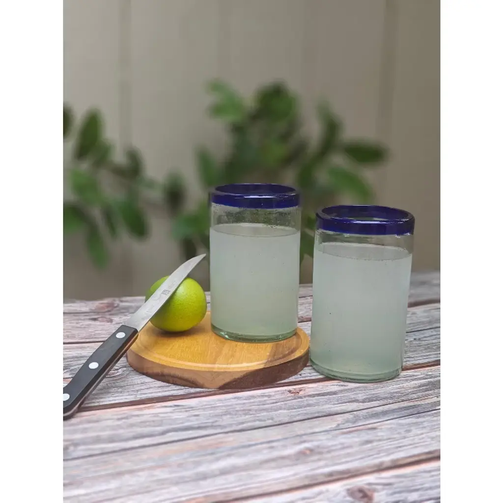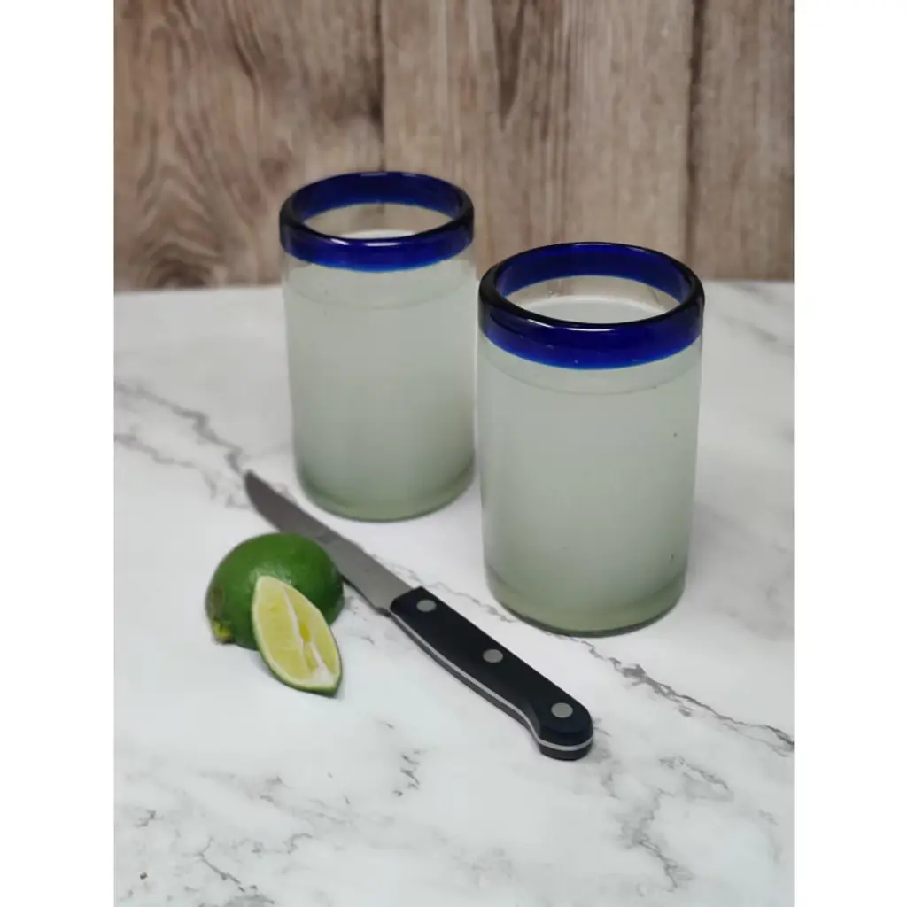 Dos Sueños Mexican Hand Blown Drinking Glasses - Blue Rim - 14oz - Set Of 2