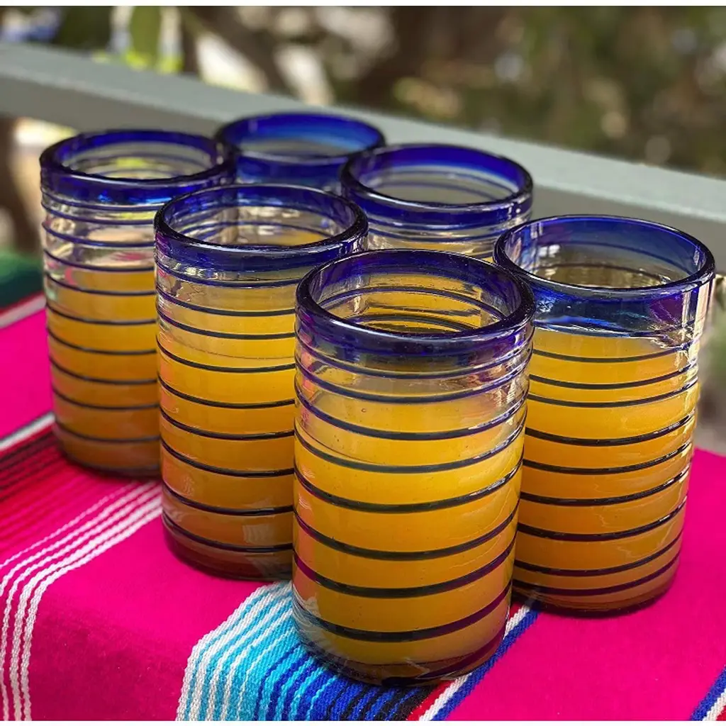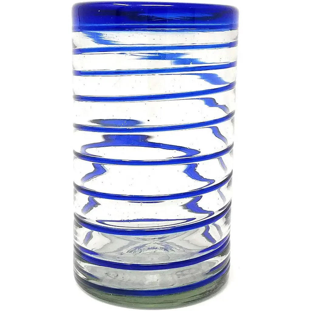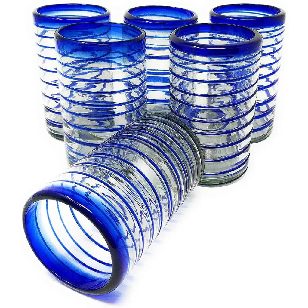 Dos Sueños Mexican Hand Blown Drinking Glasses - Blue Spiral - 14oz - Set Of 6