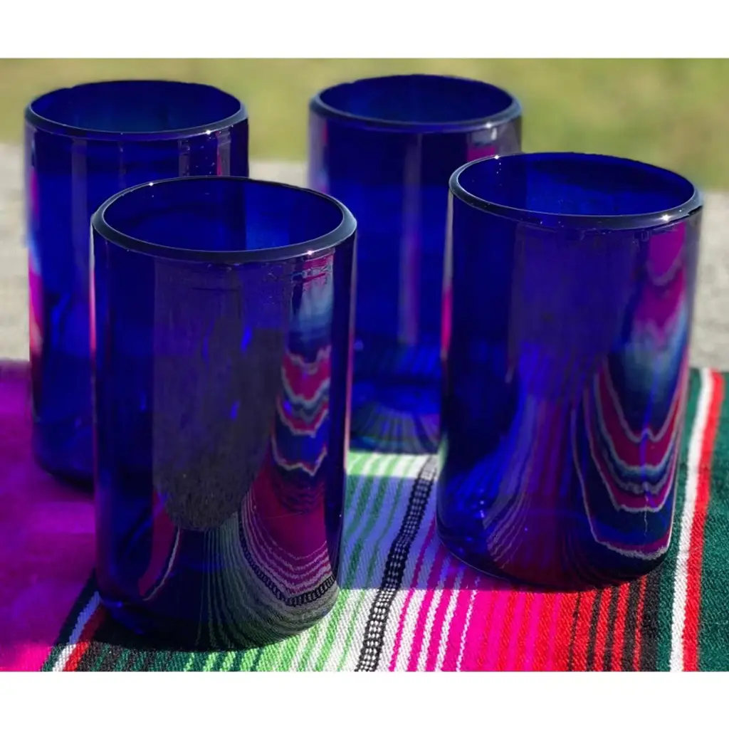 This traditional set of 4 cobalt blown glasses is perfect for your next fiesta! Use them to serve water, juice, soda or alcohol. The set adds a great sense of elegance to the dining room that will be enjoyed by everyone. Each blown glass may vary slightly in size and show tiny bubbles within the glass that develop from the blowing process. Lead-free, made from sustainable recycled glass. Hand-washing recommended, but dishwasher safe on the top rack. Exceptional artisan quality, thick and sturdy glass. Proudly hand made in Mexico.