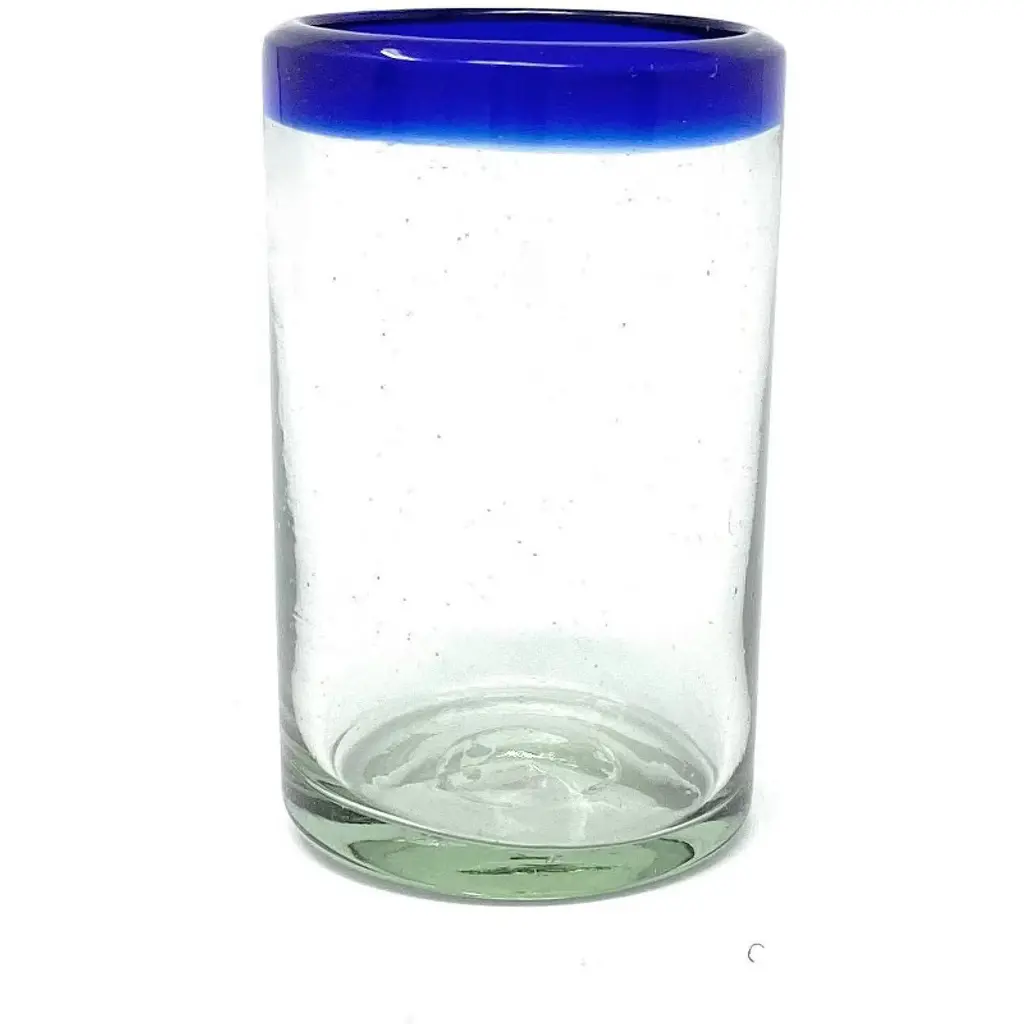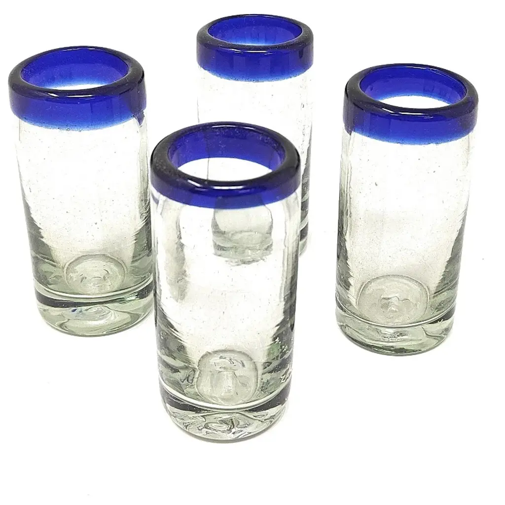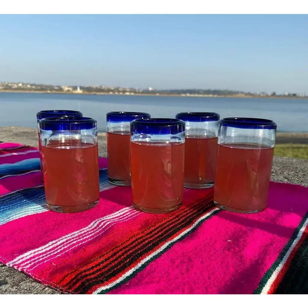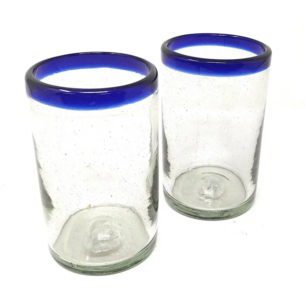This traditional set of 6 hand blown juice glasses with cobalt blue rims is perfect for your next fiesta! Use them to serve water, juice, soda or alcohol. The set adds a great sense of elegance to the dining room that will be enjoyed by everyone. Each blown glass may vary slightly in size and show tiny bubbles within the glass that develop from the blowing process. Lead-free, made from sustainable recycled glass. Hand-washing recommended, but dishwasher safe on the top rack. Exceptional artisan quality, thick and sturdy glass. Proudly hand made in Mexico.