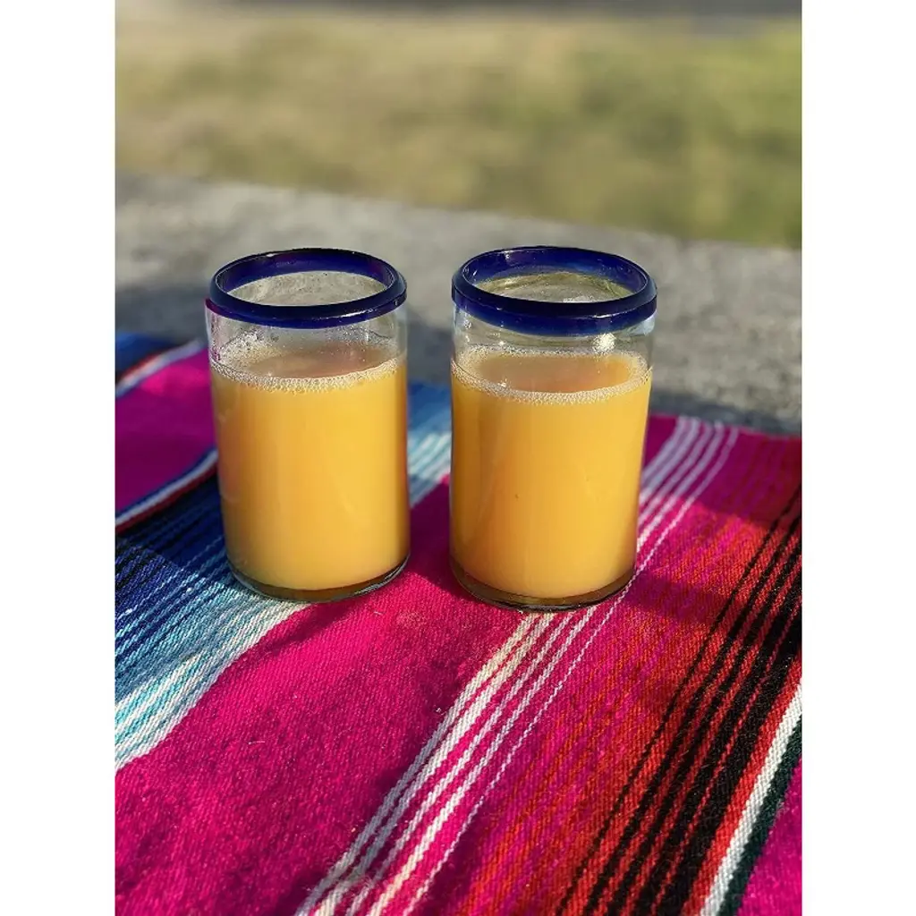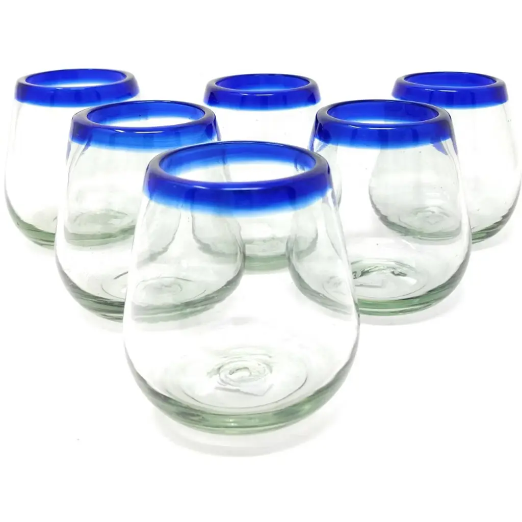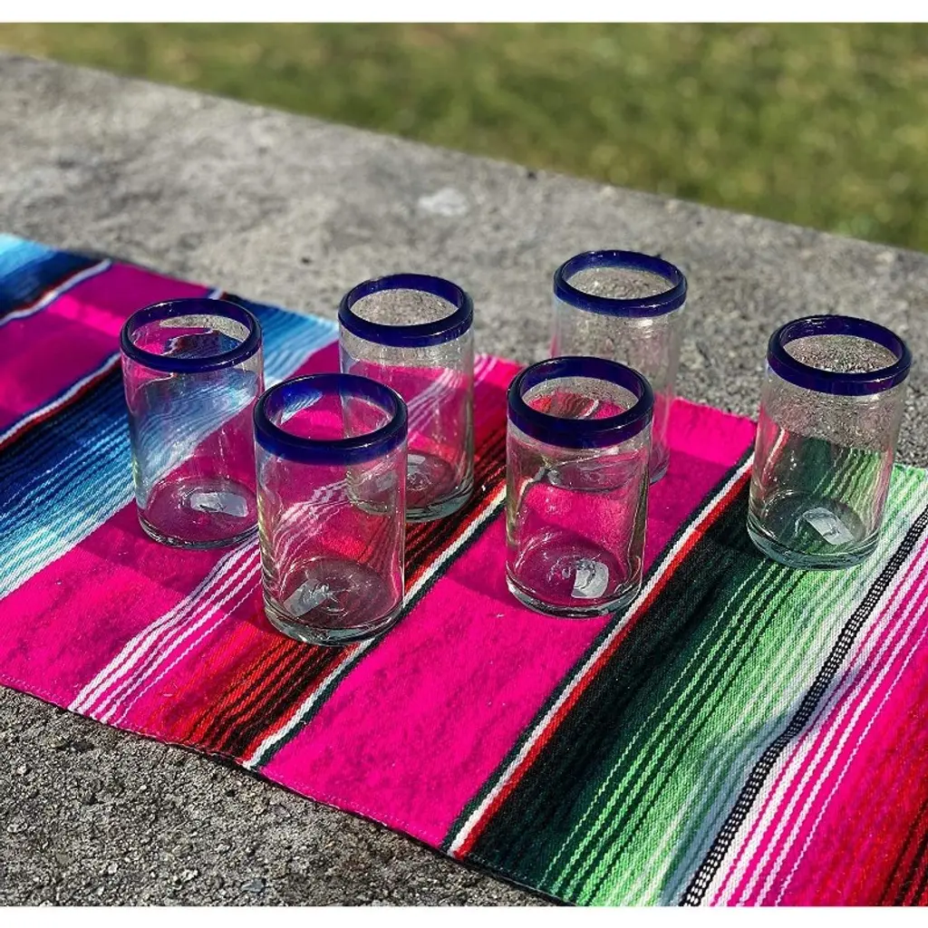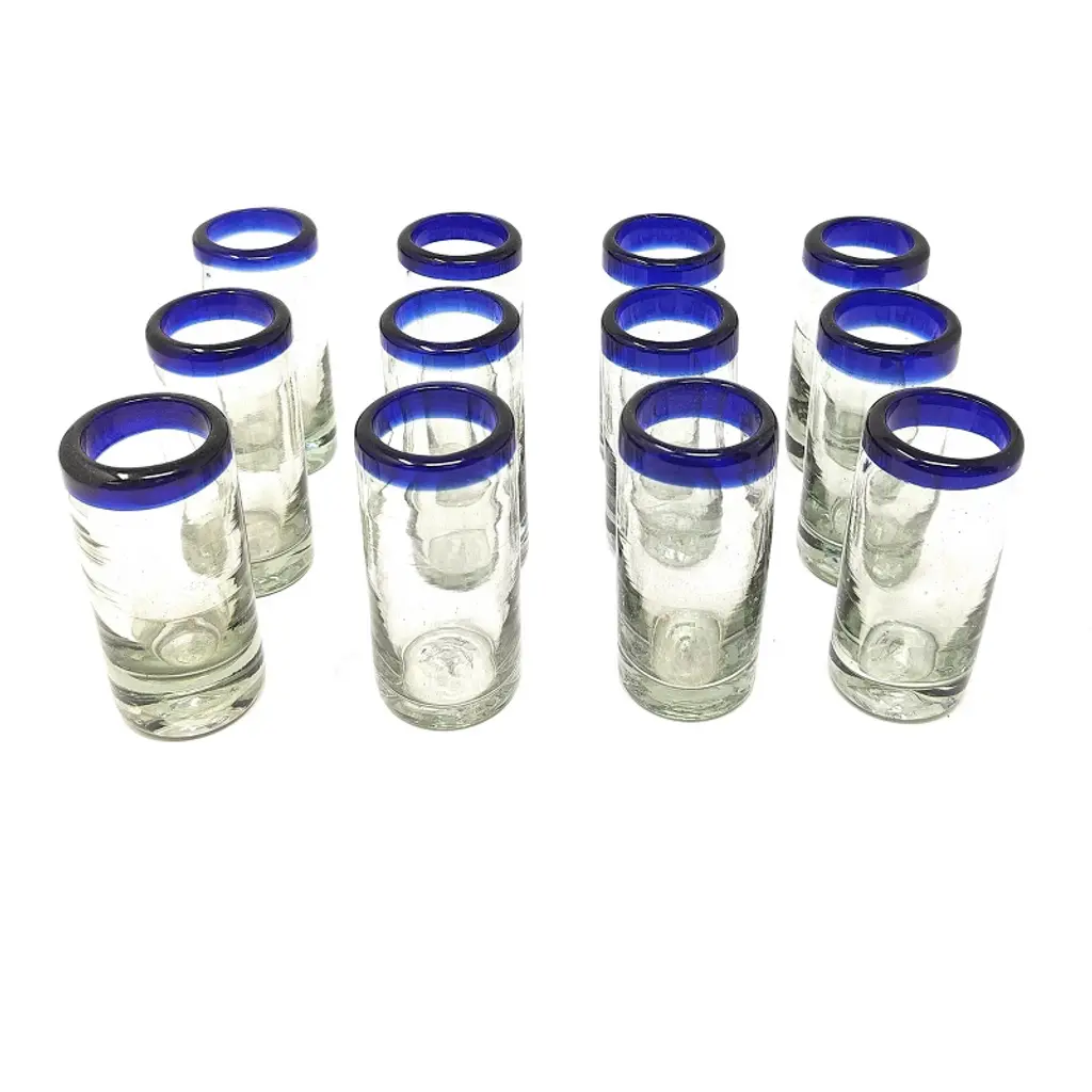 This traditional set of 6 hand blown juice glasses with cobalt blue rims is perfect for your next fiesta! Use them to serve water, juice, soda or alcohol. The set adds a great sense of elegance to the dining room that will be enjoyed by everyone. Each blown glass may vary slightly in size and show tiny bubbles within the glass that develop from the blowing process. Lead-free, made from sustainable recycled glass. Hand-washing recommended, but dishwasher safe on the top rack. Exceptional artisan quality, thick and sturdy glass. Proudly hand made in Mexico.