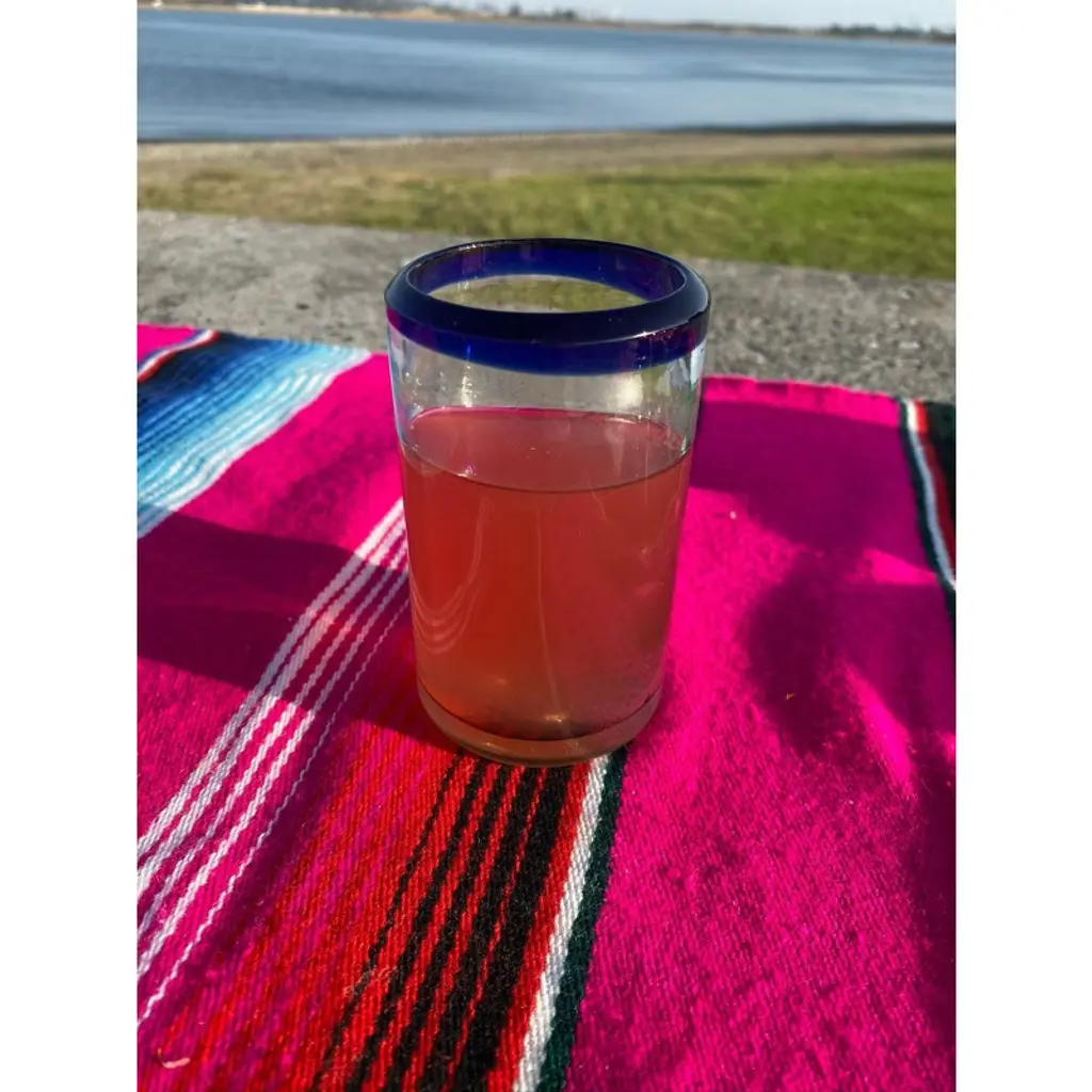 This traditional hand blown juice glass with a cobalt blue rim is perfect for your next fiesta! Use it to serve water, juice, soda or alcohol. The glass adds a great sense of elegance to the dining room that will be enjoyed by everyone. Each blown glass may vary slightly in size and show tiny bubbles within the glass that develop from the blowing process. Lead-free, made from sustainable recycled glass. Hand-washing recommended, but dishwasher safe on the top rack. Exceptional artisan quality, thick and sturdy glass. Proudly hand made in Mexico.