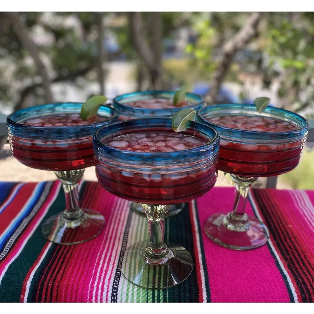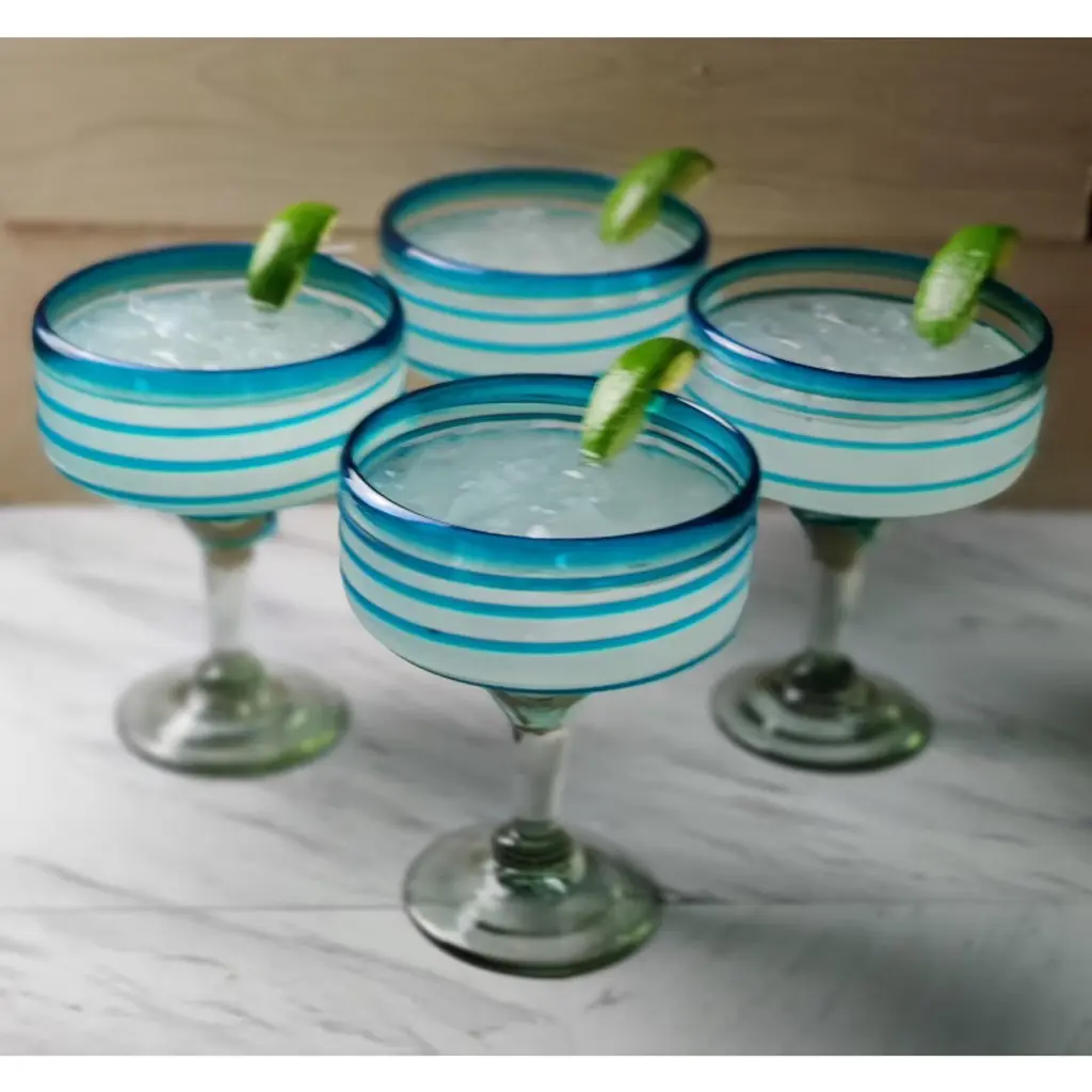 This set of 4 hand blown margarita glasses with an aqua spiral design is perfect for your next fiesta! Use them to serve your favorite delicious margaritas or juices. The set adds a great sense of elegance to the dining room that will be enjoyed by everyone. Each blown glass is made by the hands of skilled artisans, may vary slightly in size and show tiny bubbles within the glass that develop from the blowing process. Lead-free, made from sustainable recycled glass. Hand-washing recommended, but dishwasher safe if needed. Exceptional artisan quality, thick and sturdy glass. Proudly hand made in Mexico. HANDMADE – Each Mexican blown glass is handmade by skilled artisans who have been trained in the art of blown glass. TRADITION – These traditional hand blown margarita glasses are often used for celebrations and fine dining in Mexico. QUALITY – The incredible craftsmanship can be seen in these sturdy hand blown glasses. AUTHENTIC – The hand blown margarita glasses are made in Mexico. SUSTAINABLE – All of the Mexican blown glasses are made from eco-friendly 100% recycled glass. SIZE – Each margarita glass is approximately 6.5 inches in height and 4.5 inches in diameter. Size can vary slightly as these glasses are made by hand.