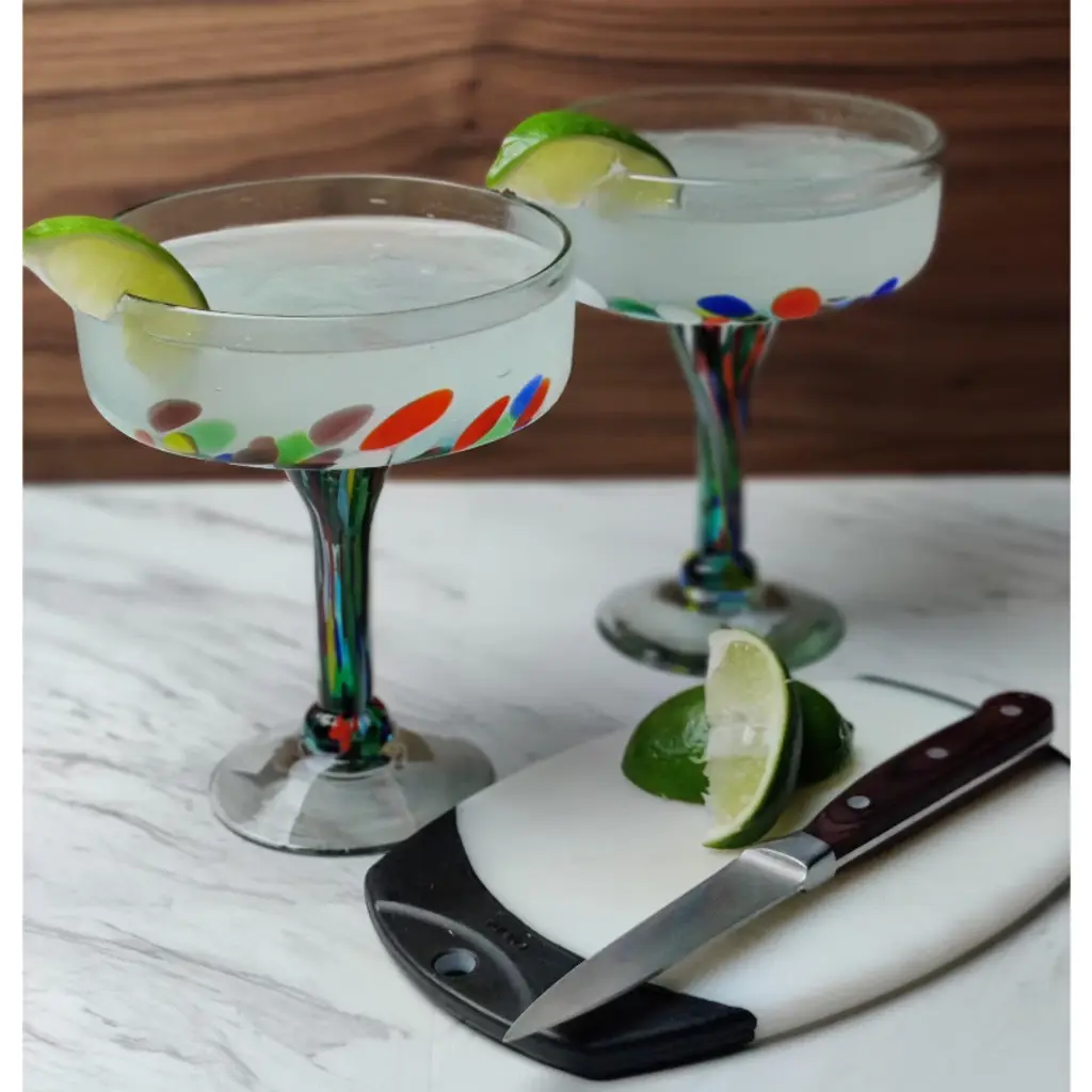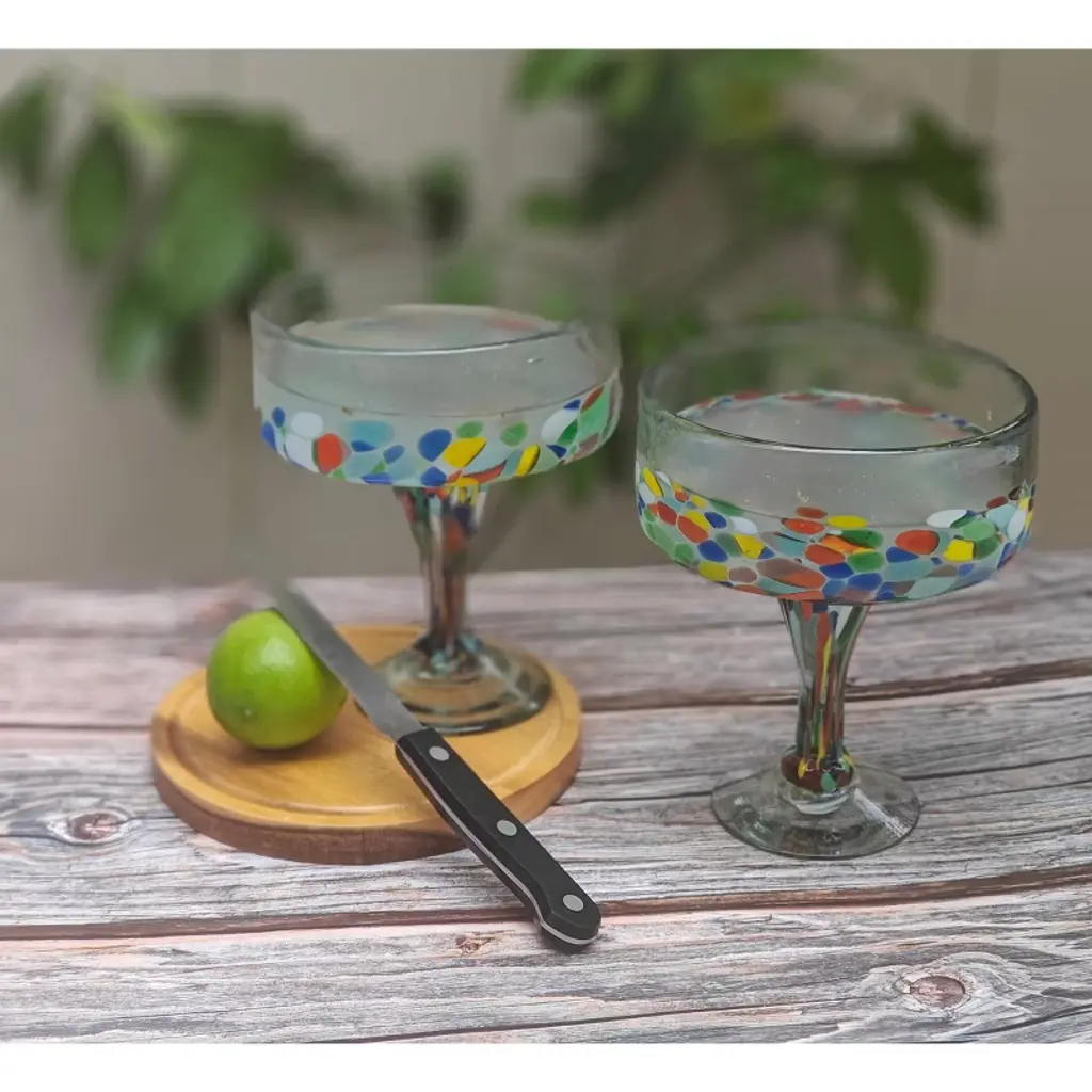 This set of 2 hand blown margarita glasses with a swirled confetti design is perfect for your next fiesta! Use them to serve your favorite delicious margaritas or juices. The set adds a great sense of elegance to the dining room that will be enjoyed by everyone. Each blown glass may vary slightly in size and show tiny bubbles within the glass that develop from the blowing process. Lead-free, made from sustainable recycled glass. Hand-washing recommended, but dishwasher safe if needed. Exceptional artisan quality, thick and sturdy glass. Proudly hand made in Mexico.