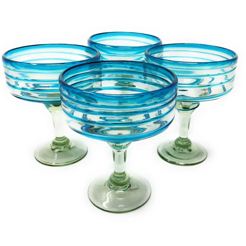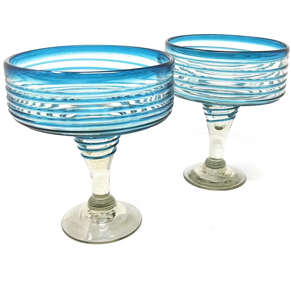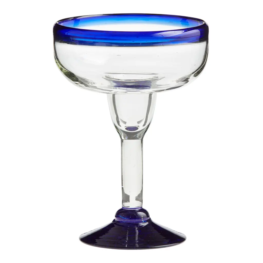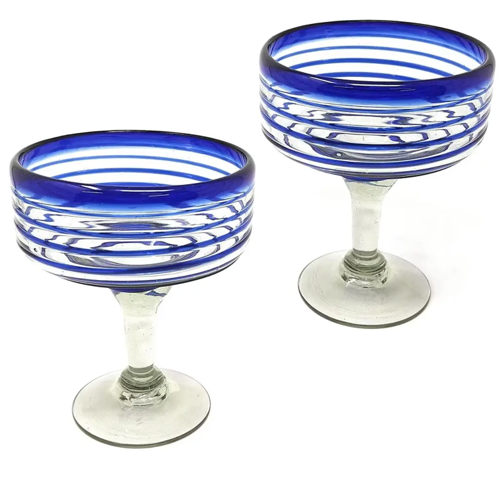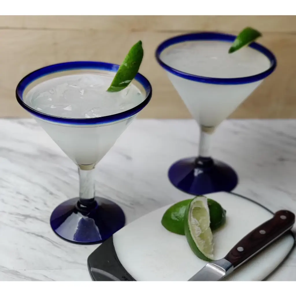 This modern set of 2 hand blown margarita glasses with blue rims is perfect for your next fiesta! Use them to serve tasty cocktails, lemonade, or your drink of choice. The martini style set adds a great sense of elegance to the dining room that will be enjoyed by everyone. Each blown glass may vary slightly in size and show tiny bubbles within the glass that develop from the blowing process. Lead-free, made from sustainable recycled glass. Hand washing recommended, but dishwasher safe on the top rack. Exceptional artisan quality, thick and sturdy glass. Proudly hand made in Mexico.
