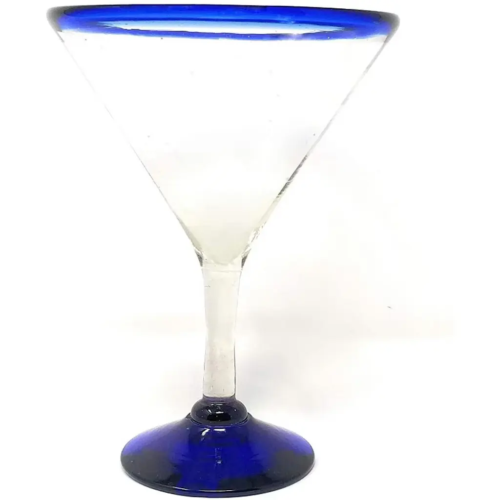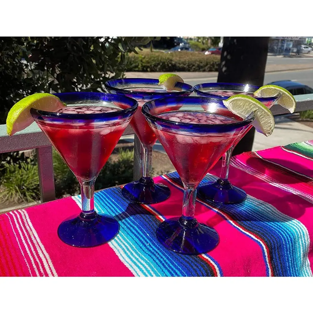 This modern set of 4 hand blown margarita glasses with blue rims is perfect for your next fiesta! Use them to serve tasty cocktails, lemonade, or your drink of choice. The martini style set adds a great sense of elegance to the dining room that will be enjoyed by everyone. Each blown glass may vary slightly in size and show tiny bubbles within the glass that develop from the blowing process. Lead-free, made from sustainable recycled glass. Hand washing recommended, but dishwasher safe on the top rack. Exceptional artisan quality, thick and sturdy glass. Proudly hand made in Mexico.