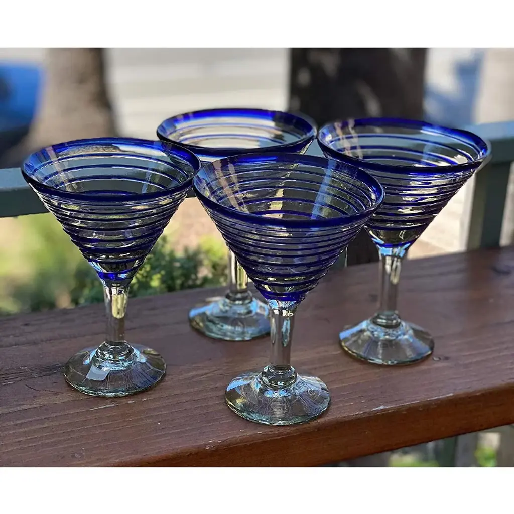 This modern set of 4 hand blown margarita glasses with a blue spiral design is perfect for your next fiesta! Use them to serve tasty cocktails, lemonade, or your drink of choice. The martini style set adds a great sense of elegance to the dining room that will be enjoyed by everyone. Each blown glass may vary slightly in size and show tiny bubbles within the glass that develop from the blowing process. Lead-free, made from sustainable recycled glass. Hand washing recommended, but dishwasher safe on the top rack. Exceptional artisan quality, thick and sturdy glass. Proudly hand made in Mexico.