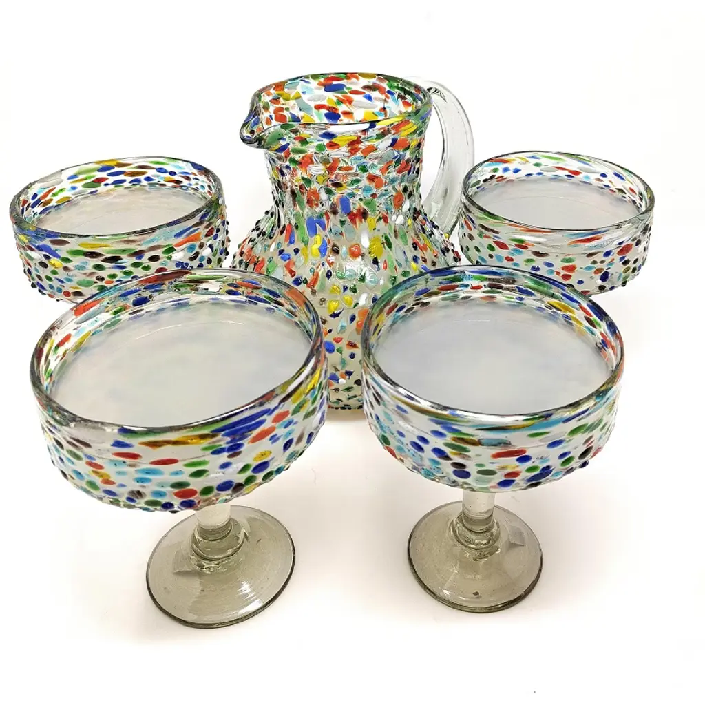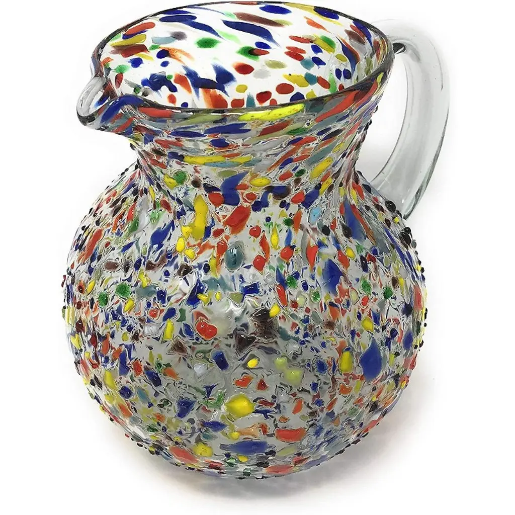 This traditional blown glass pitcher with a confetti rock design is perfect for your next fiesta! Use it to serve water, juice, soda or alcohol. The pitcher adds a great sense of elegance to the dining room or patio that will be enjoyed by everyone. Each blown glass pitcher may vary slightly in size and show tiny bubbles within the glass that develop from the blowing process. Lead-free, made from sustainable recycled glass. Hand-washing recommended, but dishwasher safe on the top rack. Exceptional artisan quality, thick and sturdy glass. Proudly hand made in Mexico.