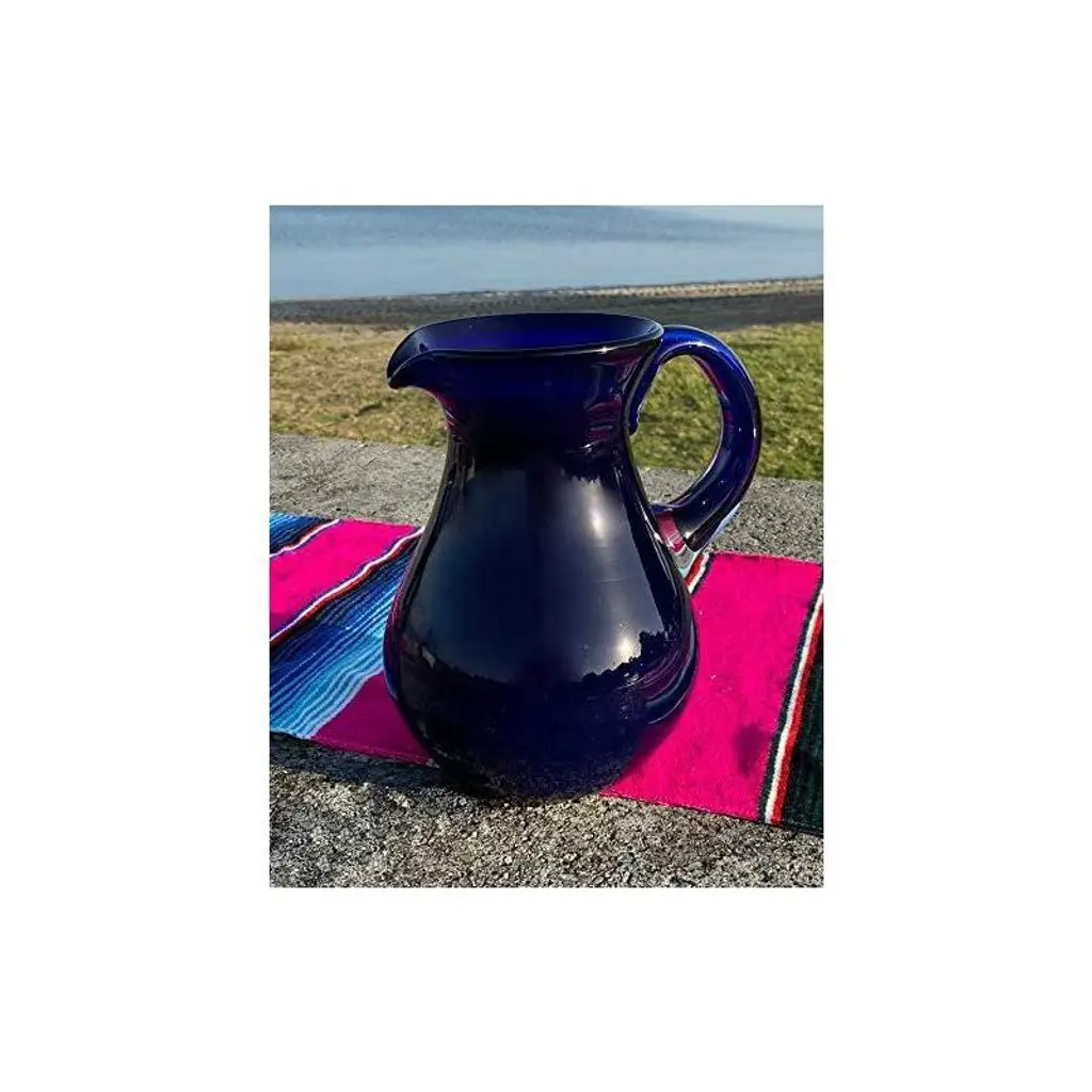 This traditional hand blown glass pitcher in cobalt is perfect for your next fiesta! Use it to serve water, juice, soda or alcohol. The pitcher adds a great sense of elegance to the dining room or patio that will be enjoyed by everyone. Each blown glass pitcher may vary slightly in size and show tiny bubbles within the glass that develop from the blowing process. Lead-free, made from sustainable recycled glass. Hand-washing recommended, but dishwasher safe on the top rack. Exceptional artisan quality, thick and sturdy glass. Proudly hand made in Mexico.