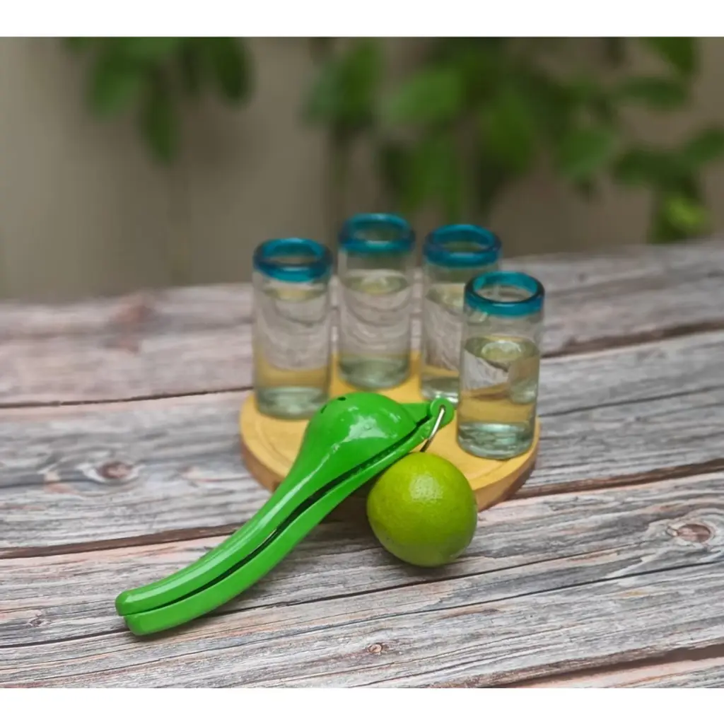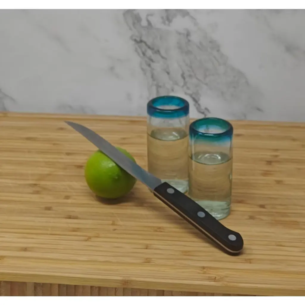 This traditional set of 4 hand blown tequila shot glasses with a aqua/teal rim is perfect for your next fiesta! Use them to serve tequila or your favorite liquor of choice. The set adds a great sense of elegance to the dining room that will be enjoyed by everyone. Each blown glass is made by the hands of skilled artisans, may vary slightly in size and show tiny bubbles within the glass that develop from the blowing process. Lead-free, made from sustainable recycled glass. Hand-washing recommended, but dishwasher safe on the top rack. Exceptional artisan quality, thick and sturdy glass. Proudly hand made in Mexico.