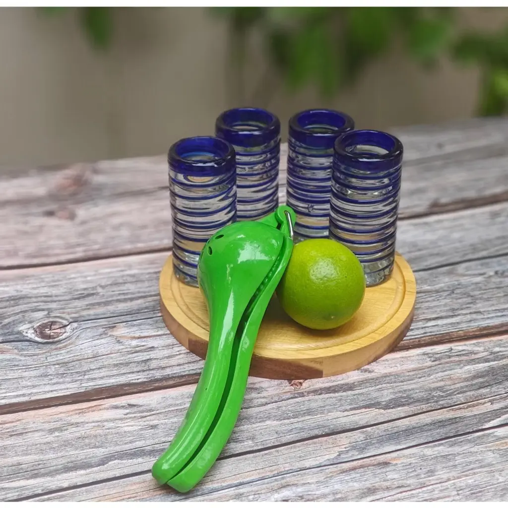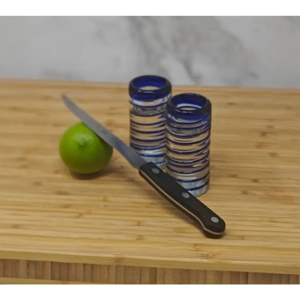 This traditional set of 4 hand blown tequila shot glasses with a blue spiral design is perfect for your next fiesta! Use them to serve tequila or your favorite liquor of choice. The set adds a great sense of elegance to the dining room that will be enjoyed by everyone. Each blown glass is made by the hands of skilled artisans, may vary slightly in size and show tiny bubbles within the glass that develop from the blowing process. Lead-free, made from sustainable recycled glass. Hand-washing recommended, but dishwasher safe on the top rack. Exceptional artisan quality, thick and sturdy glass. Proudly hand made in Mexico.