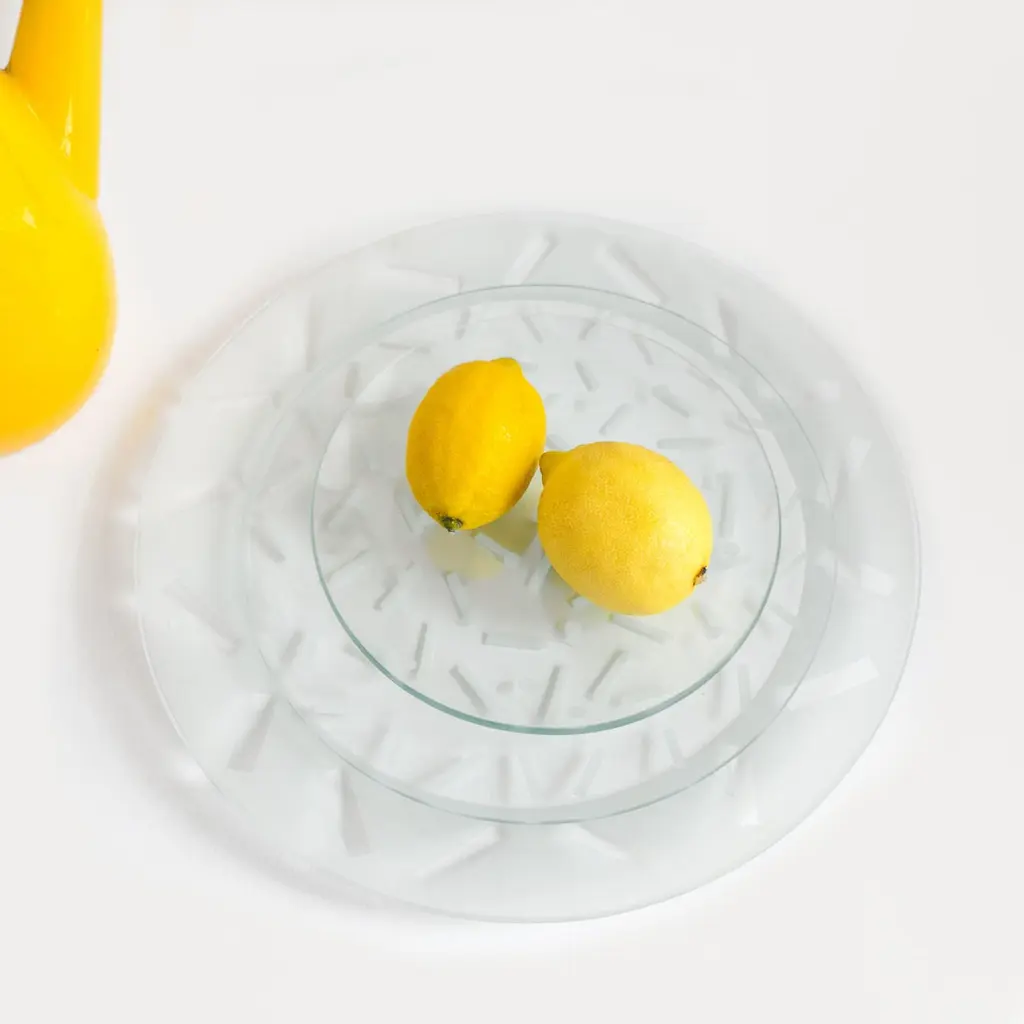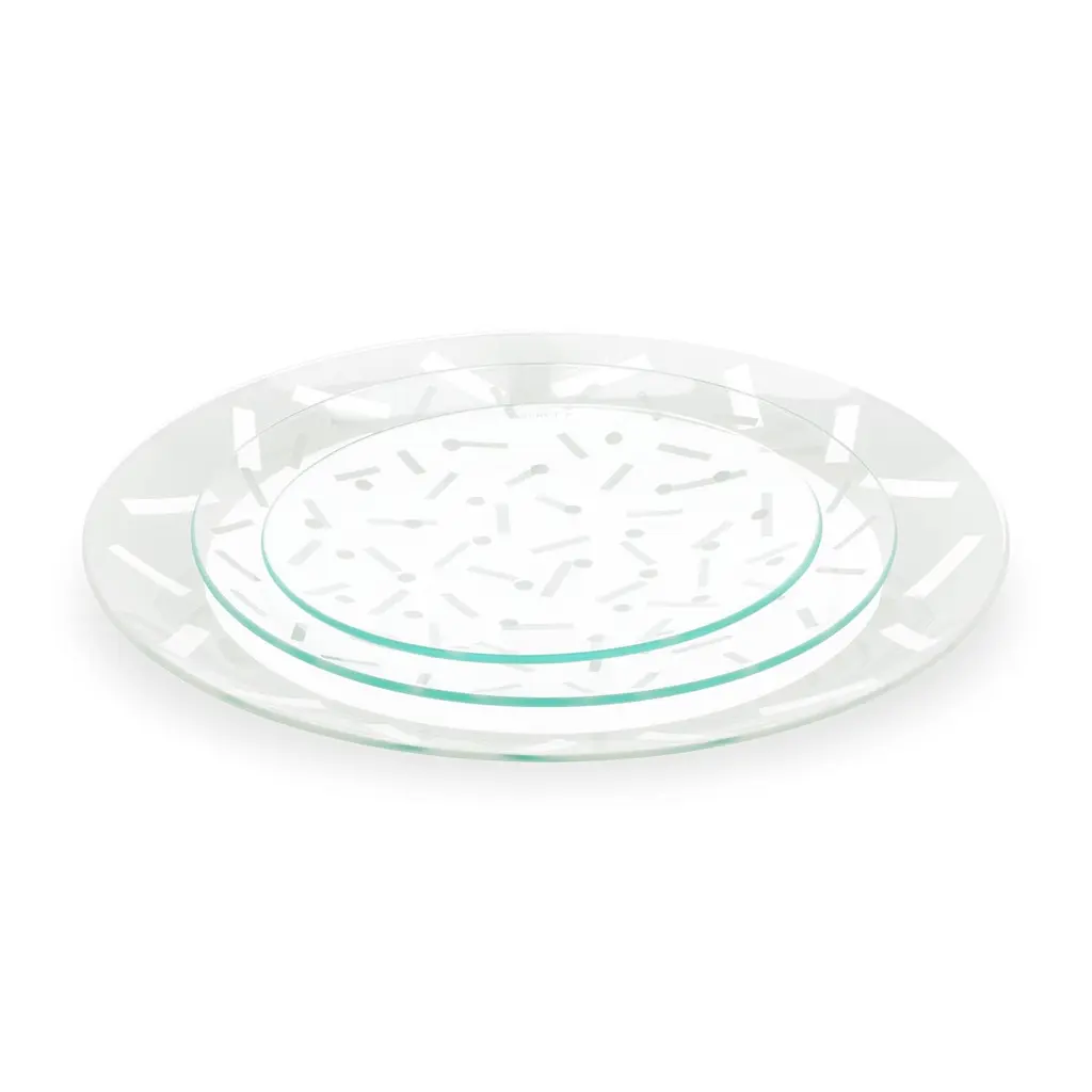 Dots and Dashes 12", 9" and 7" Plate Set.Modern, simple, and elegant glass, durable enough to last a lifetime. This set, which debuted at the MoMA Design Shop in the '80s, includes 12”, 9” and 7” round glass plates sold together or separately and is part of the Yale University Art Gallery’s permanent collection, the Brooklyn Museum of Art’s permanent collection, and the Cooper Hewitt Design Museum’s permanent collection. We use only quality sustainable materials and partially recycled glass. All our products are dishwasher and microwave safe for gentle heating. Appropriate for everyday use, hospitality, and contract, applications. Dimensions: 2 x 12.5 OZ.Material: Partially recycled glassJudy Smilow spent her entire life around great design. Her glass designs have been included in numerous publications: “The Design Encyclopedia” by Mel Byars, published by MoMA, “Product Design 3” by Joe Dolce, Yale University Art Gallery’s recent publication “American Glass: The Collections at Yale” by John Stuart Gordon, and also the exhibition and publication “Design That Works” by Lloyd E. Herman. In 2012 Judy was an invited designer as part of the Glass Lab/ Corning Museum of Glass Program. Her designs are included in several museum collections including the Brooklyn Museum of Art, Smithsonian Cooper-Hewitt National Design Museum, and Yale University Art Gallery.