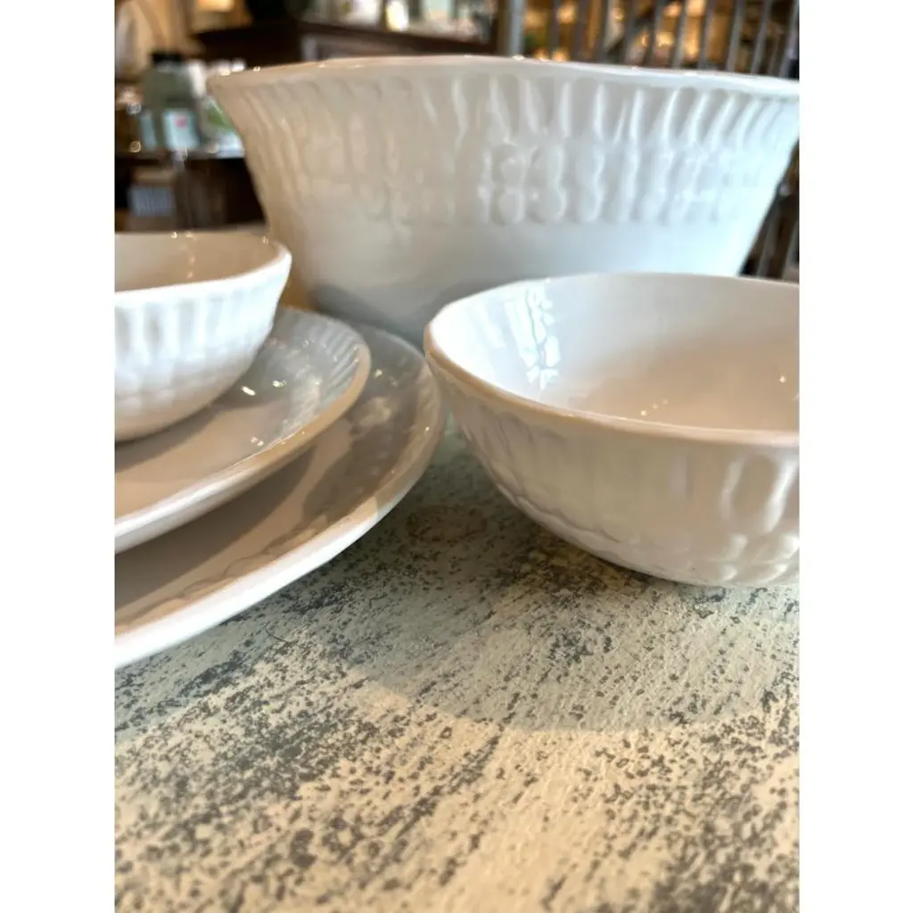 Introducing the dottie serving bowl - the perfect addition to any table! This deep and sturdy bowl won't break or crack, and its hand-molded dotted edge adds a special touch. This bowl looks like hand-thrown pottery and makes a great gift. Don't miss out on this unique and versatile piece!