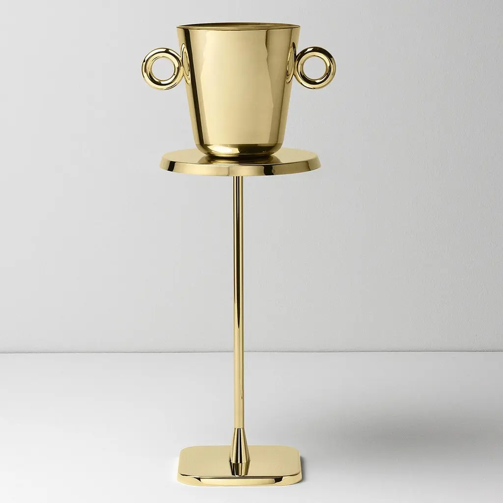 This exquisite steel ice bucket with a brass finish by Richard Hutten has a minimalist shape adorned by the presence of the two loops on each side, that give it a playful but sophisticated touch.
