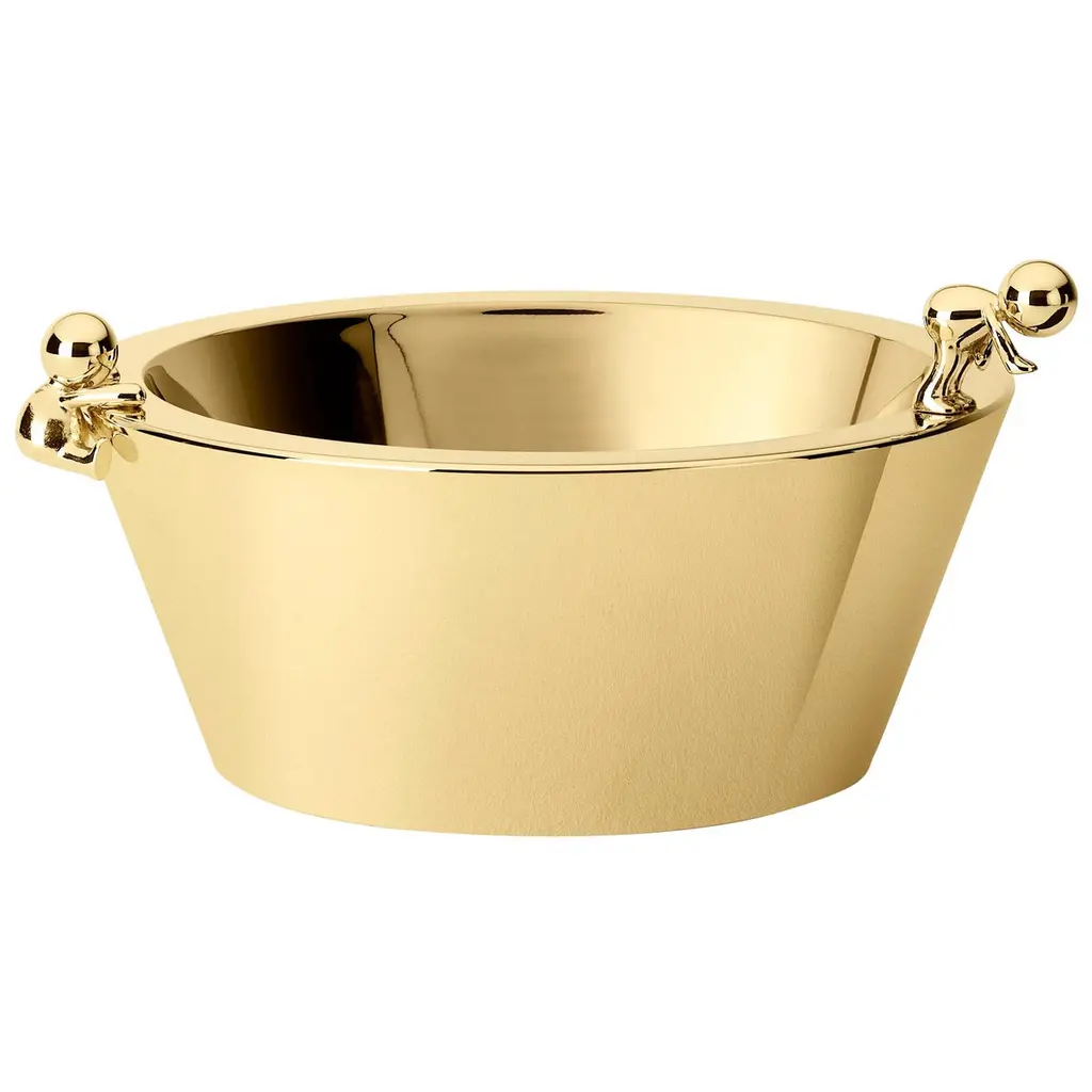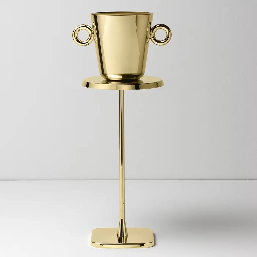 This exquisite steel ice bucket with a brass finish by Richard Hutten has a minimalist shape adorned by the presence of the two loops on each side, that give it a playful but sophisticated touch.