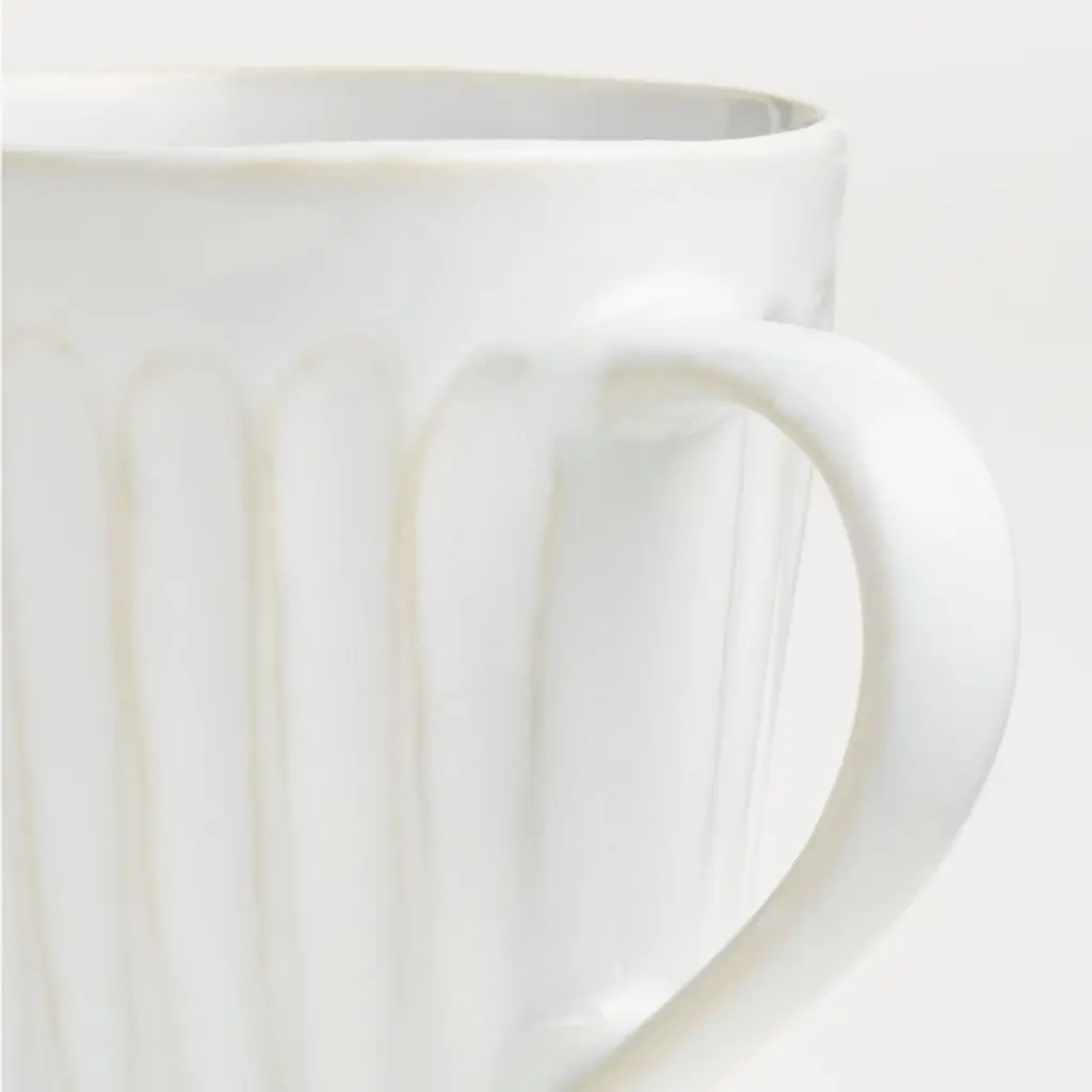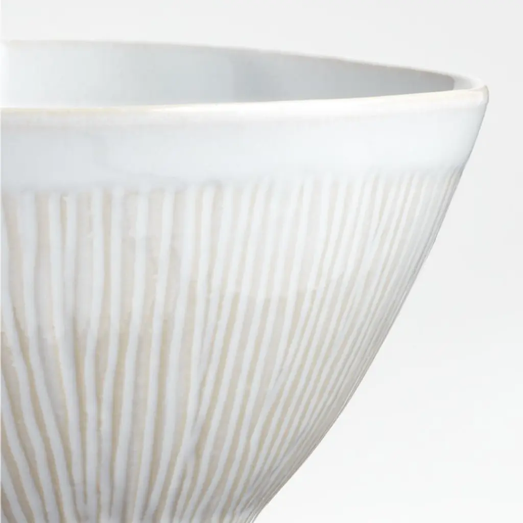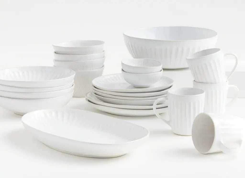 Deep indentations and perfectly imperfect lines texture this dinnerware set with the look and feel of artisan ceramics. A filmy white glaze washes over the bowl, pooling opaque in the crevices and filming the raised surfaces to show the warm color of the base clay. The four oven-safe stoneware place settings serve breakfast, lunch and dinner and clean up easily in the dishwasher. A Crate and Barrel exclusive, our Dover white dinnerware set includes four cereal bowls, mugs, salad plates and dinner plates.