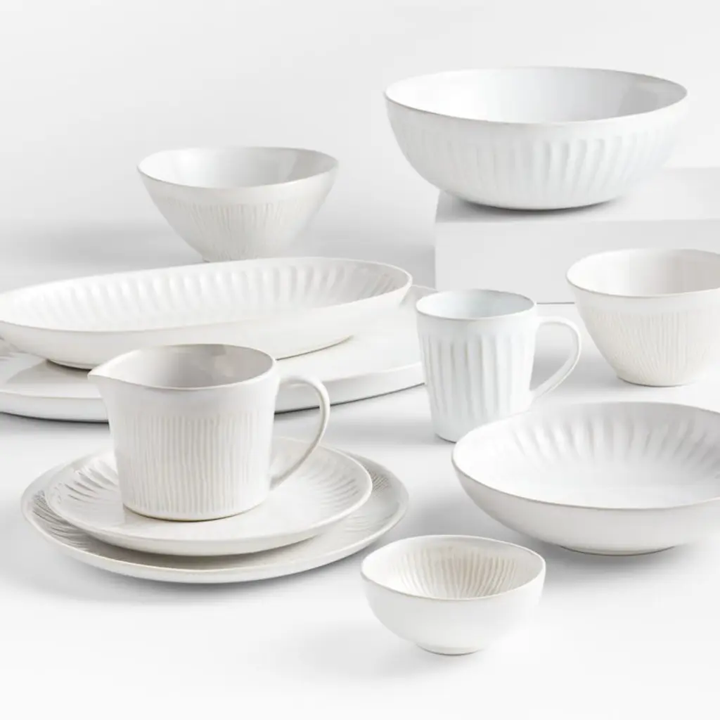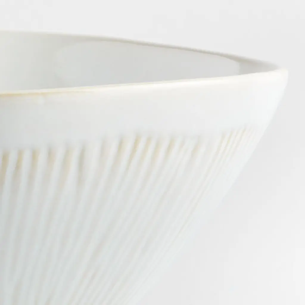 Countless perfectly imperfect lines texture the exterior of this white bowl with the look and feel of artisan ceramics. A filmy white glaze washes over the meal bowl, pooling opaque in the crevices and filming the raised surfaces to show the warm color of the base clay. The oven-safe stoneware dish serves everything from hearty salads to grain or smoothie bowls and cleans up easily in the dishwasher. Part of our Dover white dinnerware and serveware collection, this meal bowl is a Crate & Barrel exclusive.