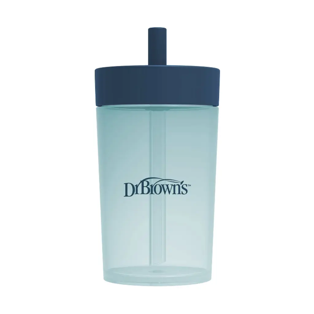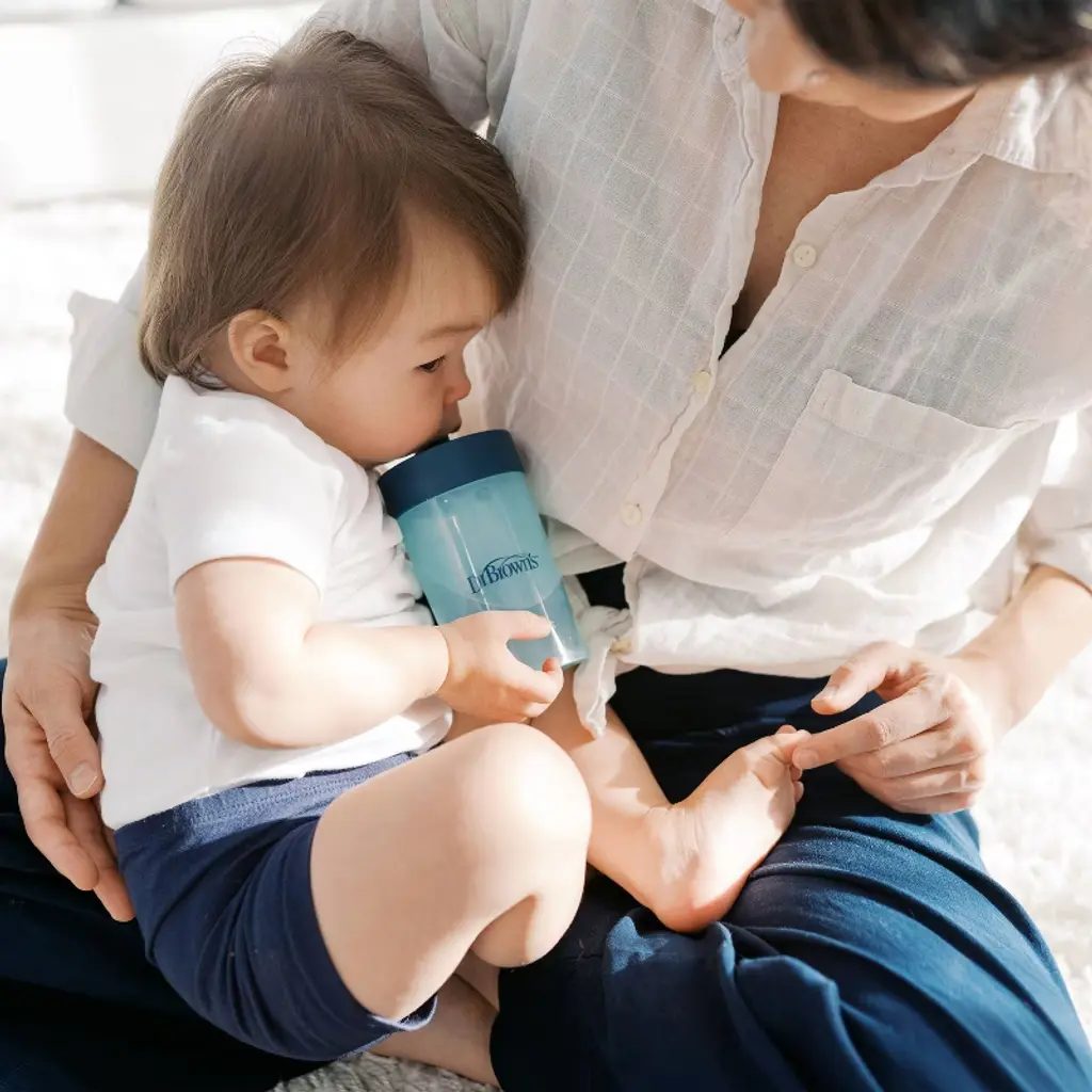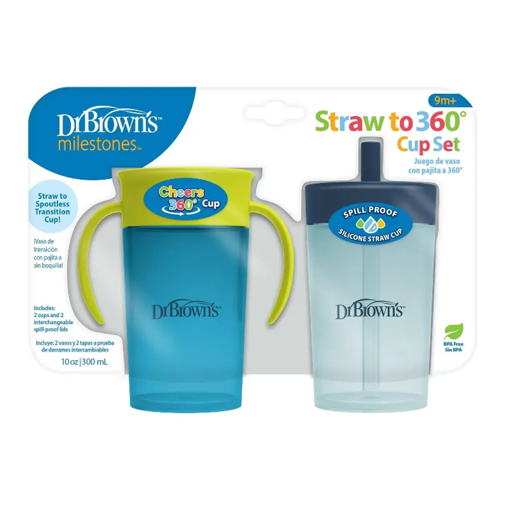 The all-in-one set to help baby transition to straw and big kid sipping. Dr. Brown's Straw to 360° Cup Set includes a lid with super soft silicone straw to help baby develop new straw-sipping skills. The silicone is gentle on baby's sensitive mouth and is spill-proof! Then when baby is ready, switch to the Cheers360 sippy cup lid. The 360-degree design lets baby drink from any edge, and the Sip and See clear silicone valve lets baby see inside without spilling for true leak-free learning. The Cheers360 lid features handles that are easy for little hands to grasp and tilt while developing independent drinking skills. The cup is translucent so you can see when it's time for a refill, and the easy to assemble three-piece design is dishwasher (top rack) and sterilizer safe for easy cleaning.