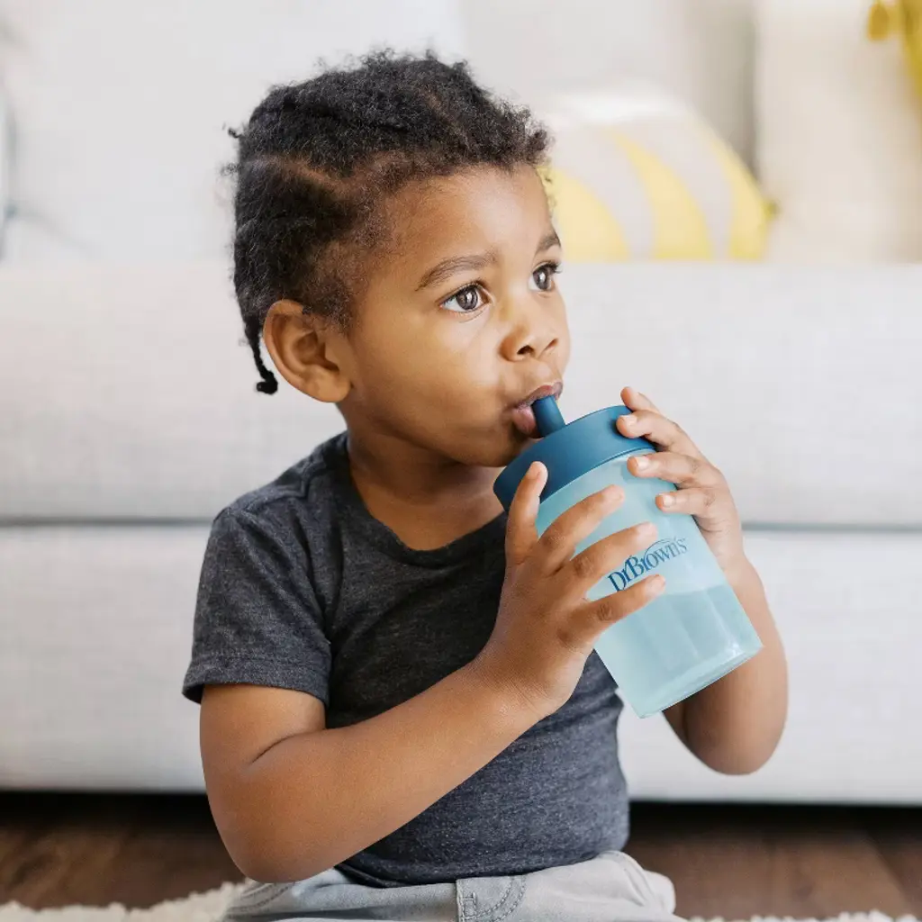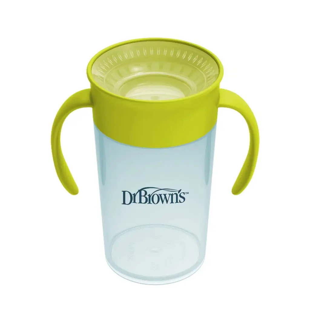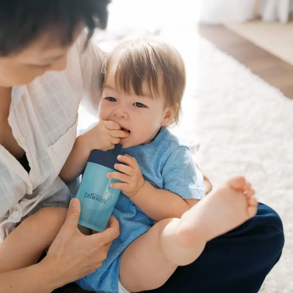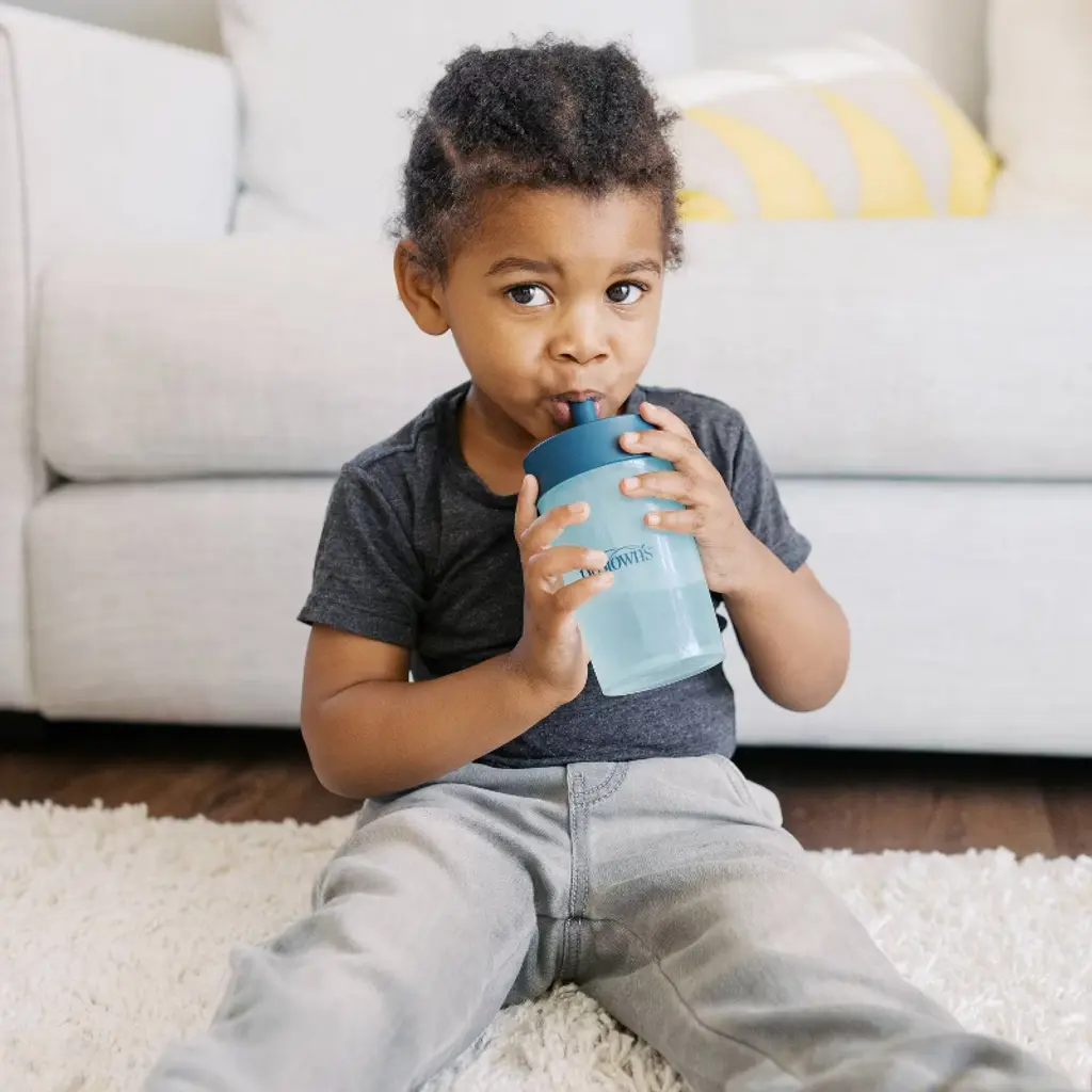 The all-in-one set to help baby transition to straw and big kid sipping. Dr. Brown's Straw to 360° Cup Set includes a lid with super soft silicone straw to help baby develop new straw-sipping skills. The silicone is gentle on baby's sensitive mouth and is spill-proof! Then when baby is ready, switch to the Cheers360 sippy cup lid. The 360-degree design lets baby drink from any edge, and the Sip and See clear silicone valve lets baby see inside without spilling for true leak-free learning. The Cheers360 lid features handles that are easy for little hands to grasp and tilt while developing independent drinking skills. The cup is translucent so you can see when it's time for a refill, and the easy to assemble three-piece design is dishwasher (top rack) and sterilizer safe for easy cleaning.