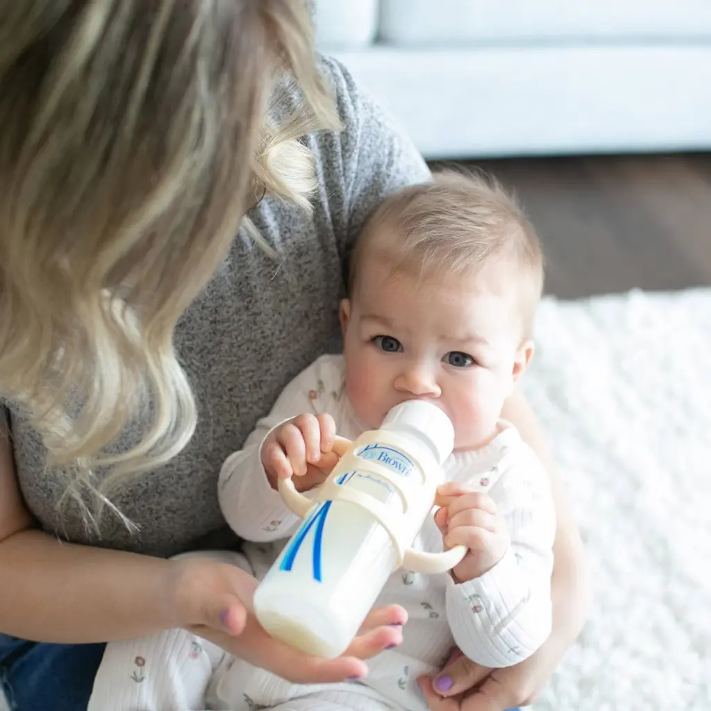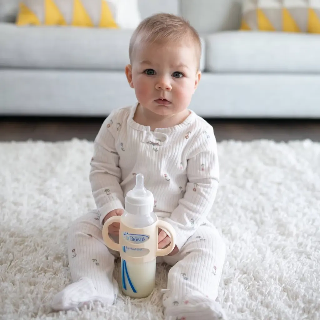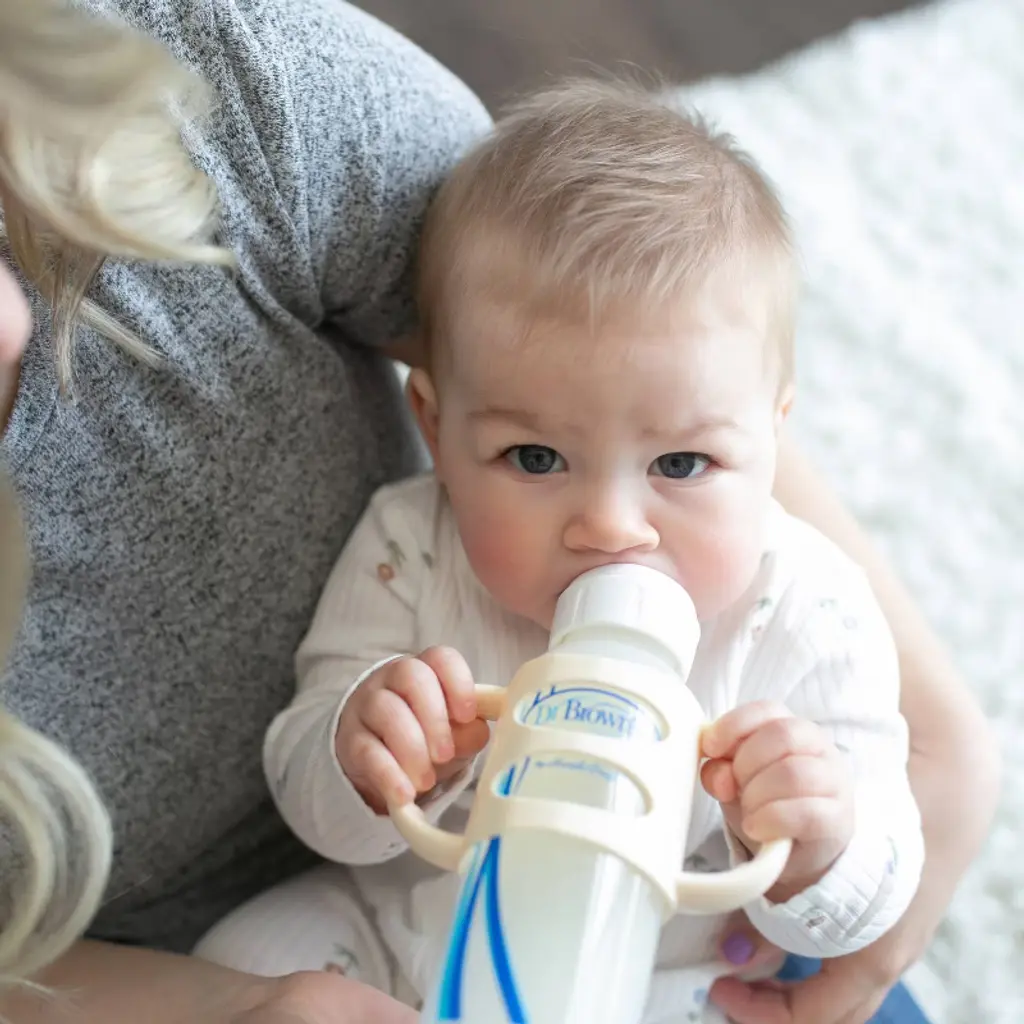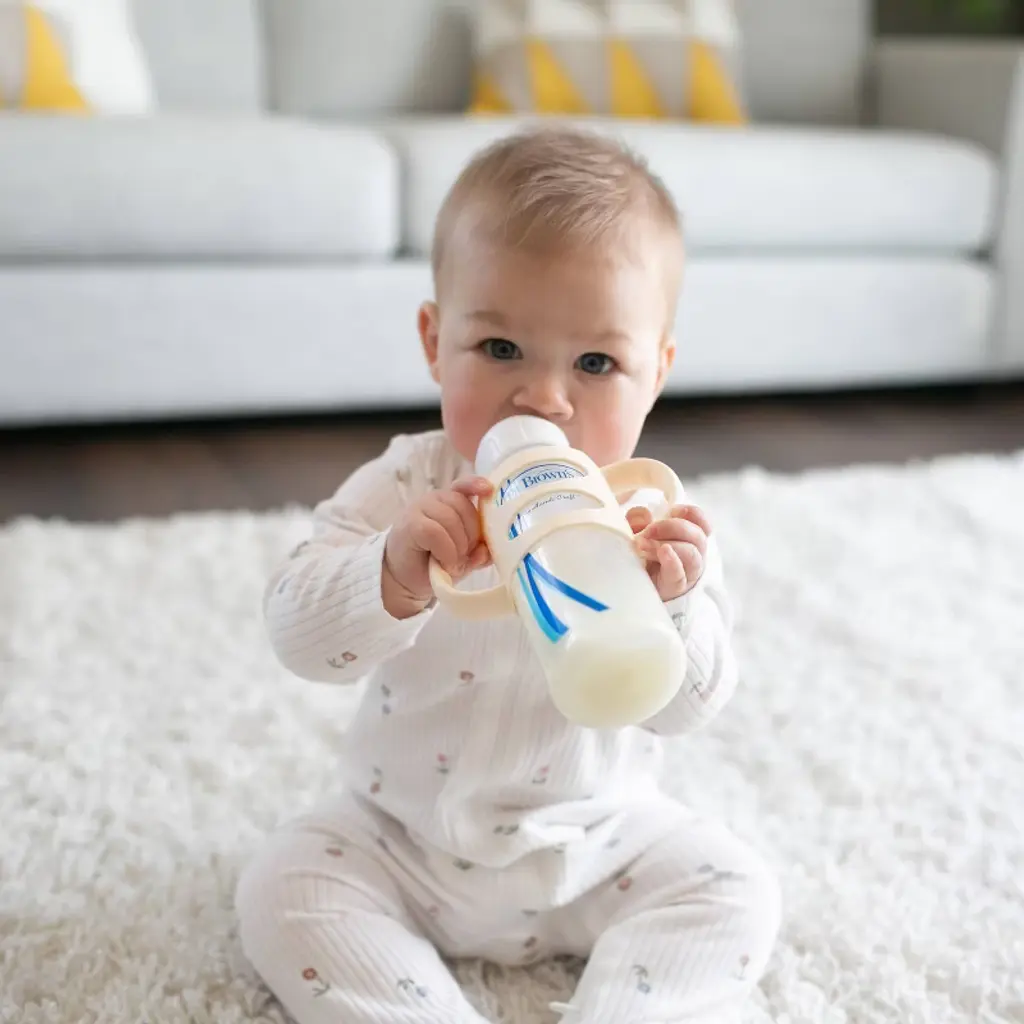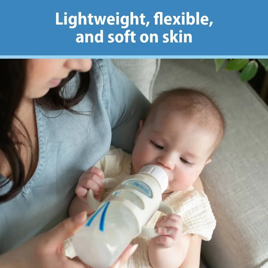 Help baby learn independent drinking skills with the no-slip, easy-grip Dr. Brown's Silicone Handles. Introducing a sippy with handles has never been simpler - they fit all Dr. Brown's Narrow bottles already familiar to baby. The lightweight, flexible silicone handles are soft and easy to hold so baby can develop motor skills and practice grabbing and drinking on their own. The handle is designed specifically for little hands to hold, featuring a thin shape and grippy ridges. The removable handles are easy to slide on and off the bottle, and you don't need to remove them to wash or sterilize! Dishwasher (top rack only) and sterilizer safe. 4m+. BPA free