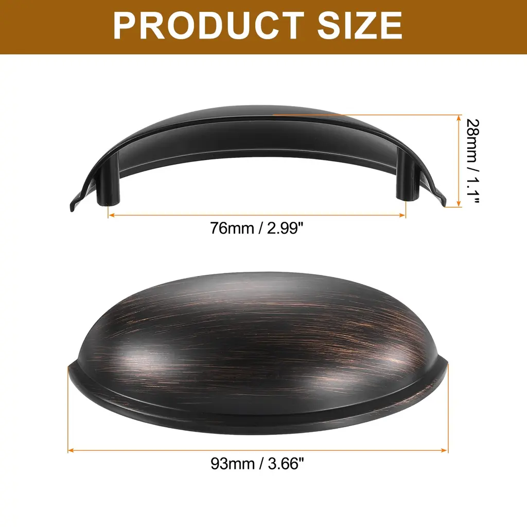 [Good Material] - Made from good quality zinc alloy, our drawer pull offers strength and durability for long-lasting performance. The material's robust nature ensures stability and reliability, it ensures a comfortable and secure grip.[Simple Appearance] - Crafted with a half-moon drawer pull shape, our sleek and simple drawer pulls elevate the look of your furniture. The elegant design adds a touch of sophistication to your dressers and cabinets, creating a cohesive and stylish aesthetic in any room or space.[Easy to Use] - The standard hole spacing makes it simple to replace existing hardware. If you are replacing handles, please measure and make sure the center-to-center spacing of the two holes on your cabinet matches the spacing of our handles. Insert the included screws into the back of the cabinet door or drawer and secure the drawer cup pull.[Scope of Application] - These versatile pulls offer a functional and decorative solution, suitable for use as cabinet and drawer handles, kitchen pulls, or dresser handles. These versatile drawer pulls and handles add a stylish and practical touch to your furniture.Specification:Overall Size: 93 x 36 x 28 mm / 3.66" x 1.42" x 1.1" (L x W x H)Hole Distance: 76mm / 2.99"Material: Zinc AlloySurface Treatment: PlatingColor: BlackPackage Content: 25Pcs x Drawer Pulls with 50Pcs 1" x Mounting Screws, 50Pcs 1-3/4" x Mounting Screws