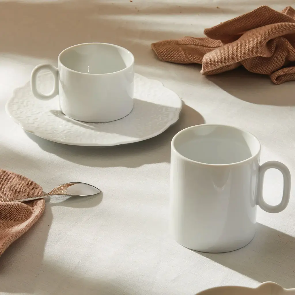 Elegance and subtlety make the perfect pair in the Dressed collection designed by Dutch designer Marcel Wanders for Italian brand Alessi. The Dressed Teacup set features the series’ refined clean lines and forms that are enhanced by delicate decorative patterns. Each teacup is made from high-quality white porcelain and features a distinctive ring-shaped handle and a minimalist shape without any tapering. Great for everyday use and special occasions in equal measure, this set comes with four teacups. Saucers with beautifully embossed motifs are also available separately, along with matching coffee cups. Conveniently both microwave and dishwasher safe.