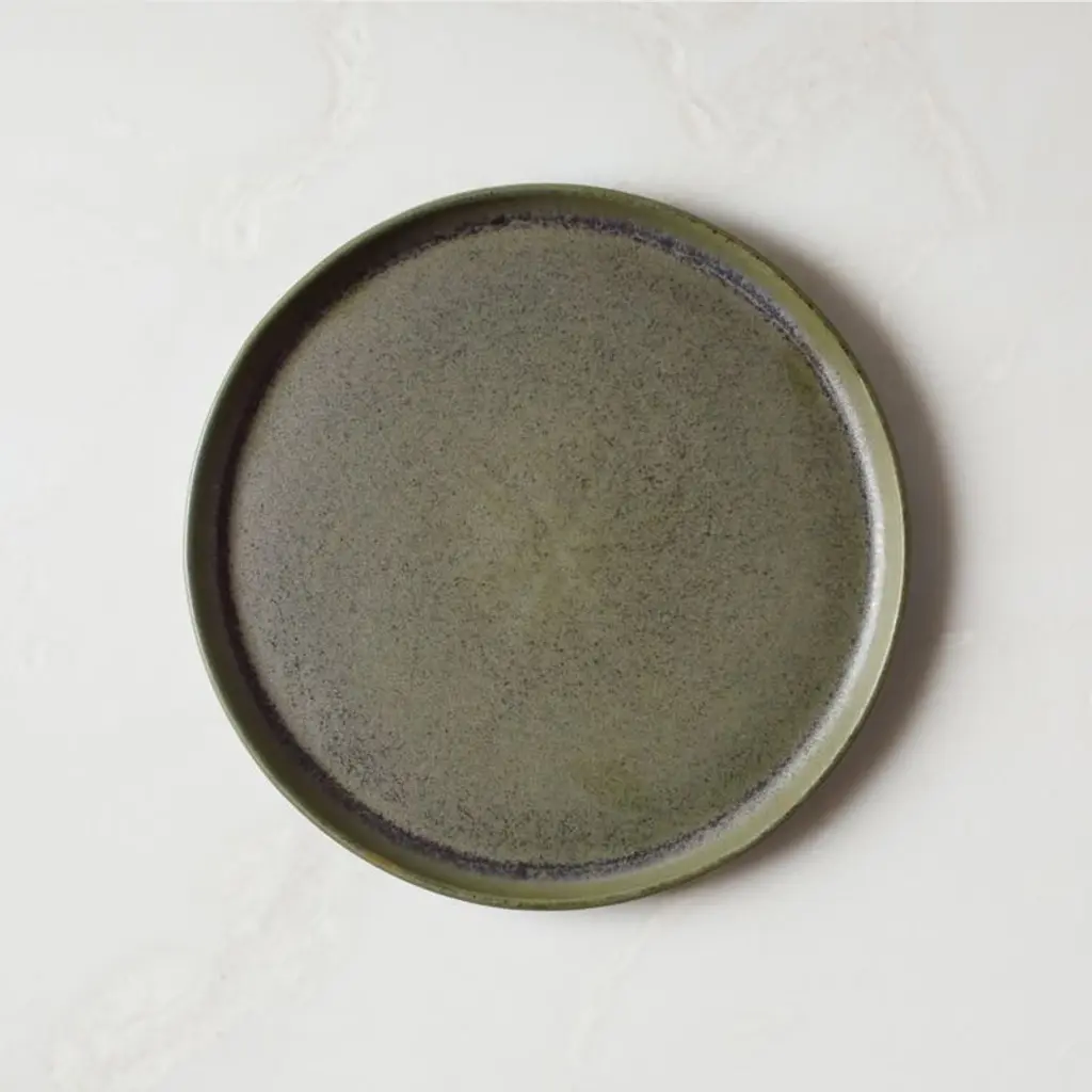 Expert craftsmanship leaves its mark on our best-selling Drift salad plate. Pressed with a lipped edge, the round stoneware is finished by hand with a matte green reactive glaze that behaves beautifully when kiln-fired. What surfaces is a subtle crackled texture that makes each piece unique. Part of the Drift green dinnerware collection; also looks great with Drift dinnerware in tan, ivory, dark blue and lilac. CB2 exclusive.