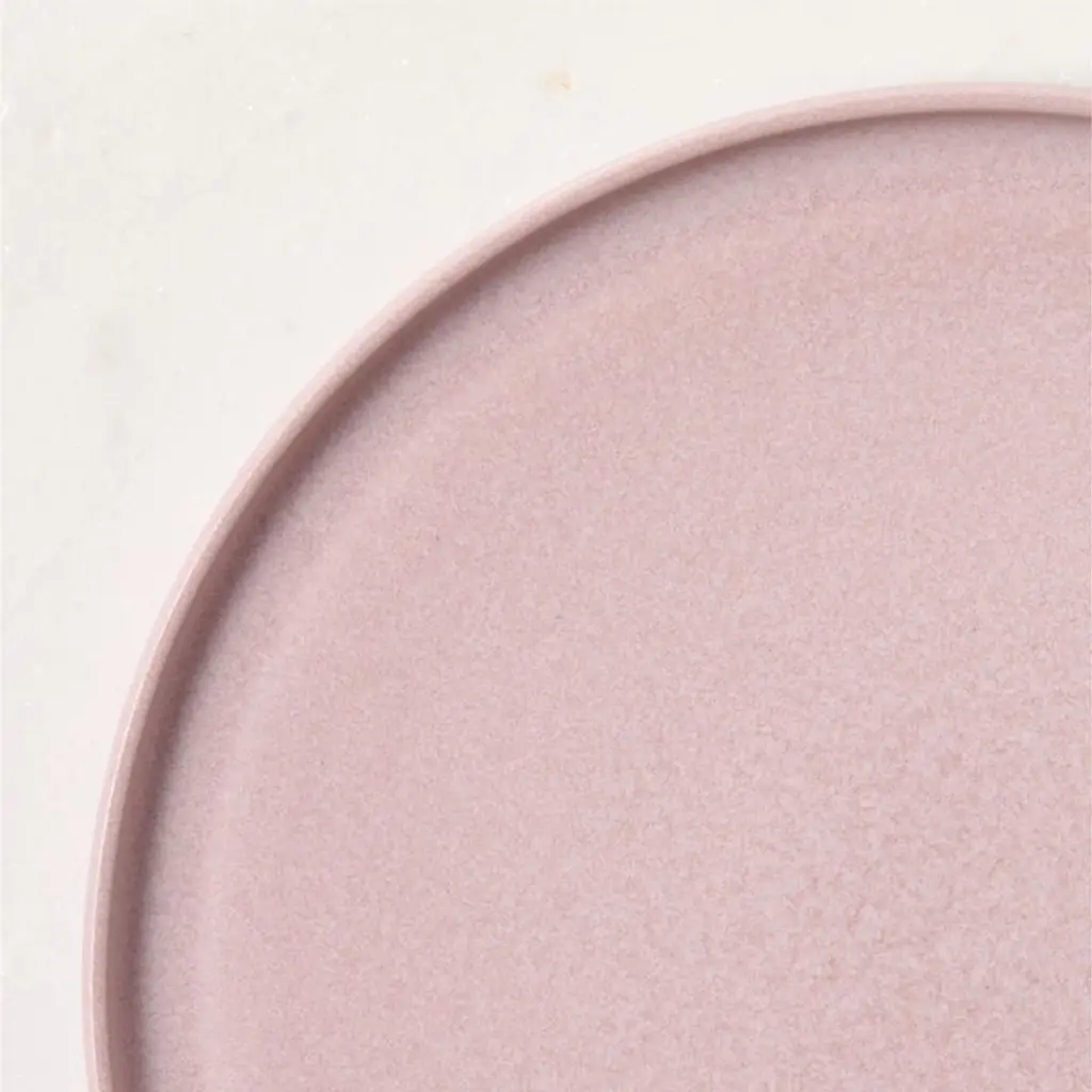 Expert craftsmanship leaves its mark on our best-selling Drift dinner plate. Pressed with a lipped edge, the round stoneware is finished by hand with a lilac reactive glaze that behaves beautifully when kiln-fired. What surfaces is a subtle crackled texture that makes each piece unique. Part of the Drift lilac dinnerware collection; also looks great with Drift dinnerware in green, ivory, dark blue and tan. CB2 exclusive.