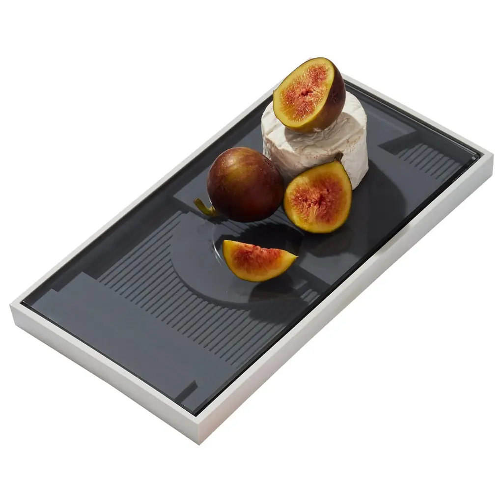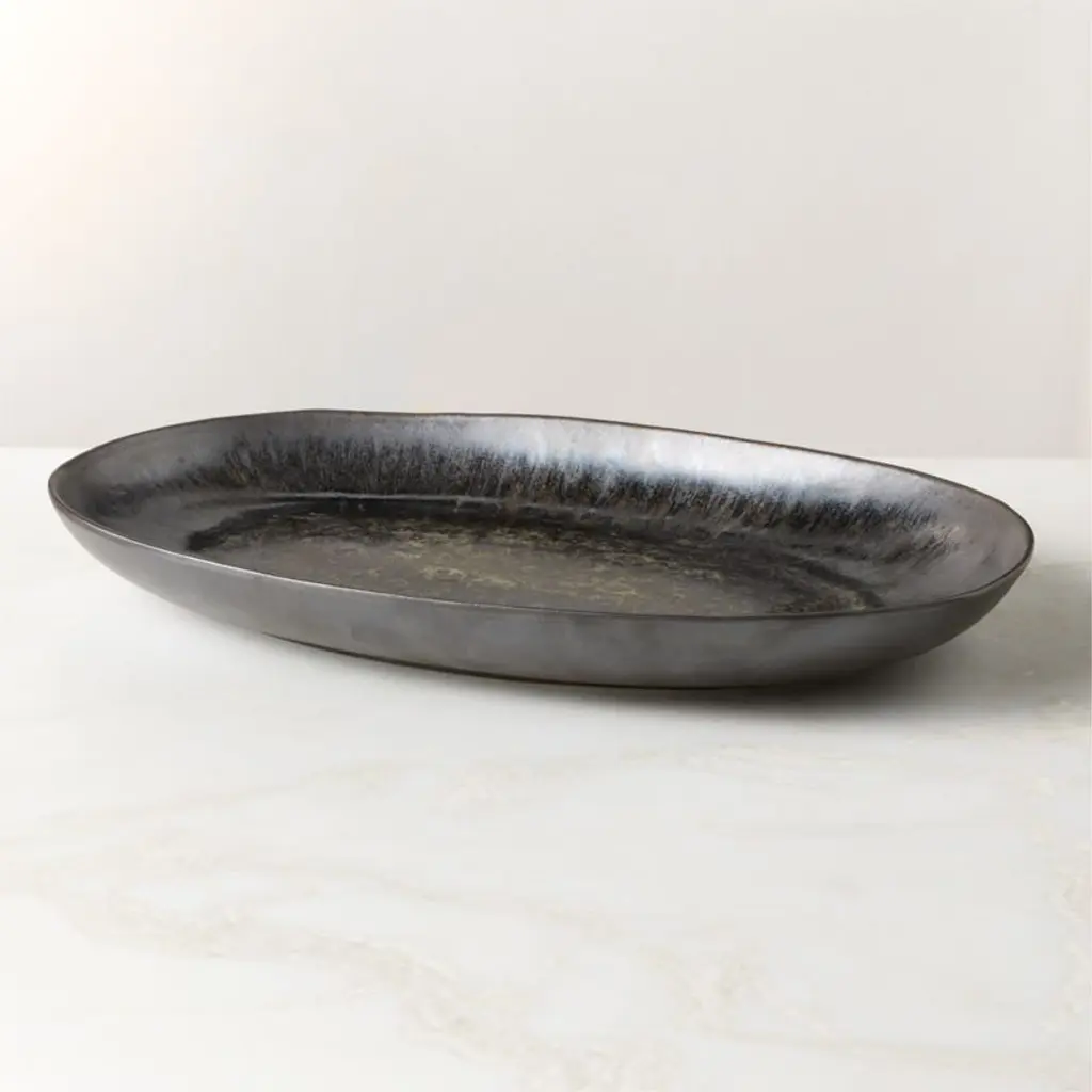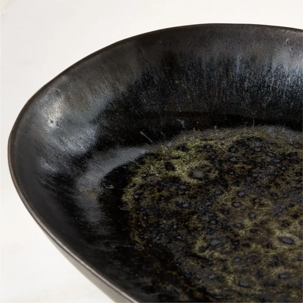 Expert craftsmanship leaves its mark on our best-selling Drift serving tray. The pressed stoneware is finished by hand with a highly reactive black glaze that behaves beautifully when kiln fired. What surfaces is a subtle crackled texture with pops of metallic black and green that makes each piece unique. Part of the Drift dinnerware collection; also looks great with Drift dinnerware in green and white. CB2 exclusive.