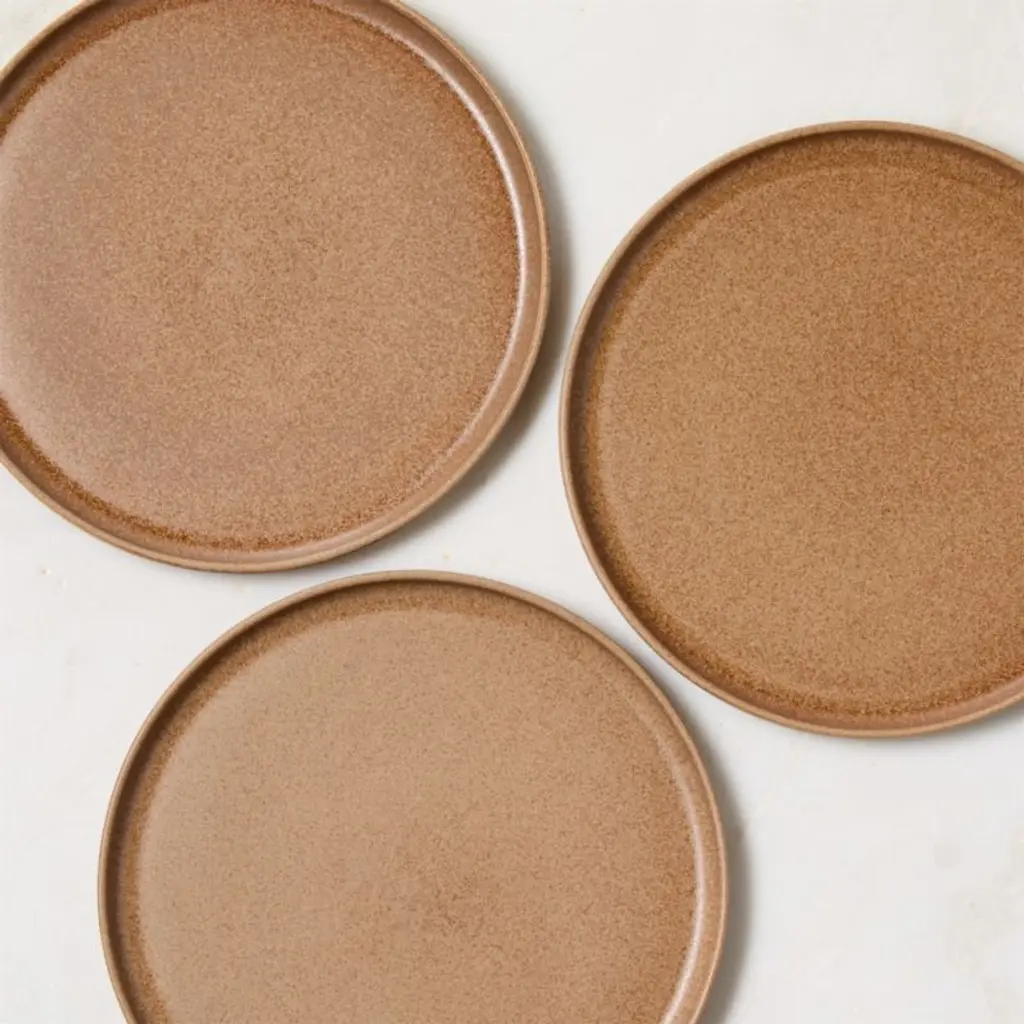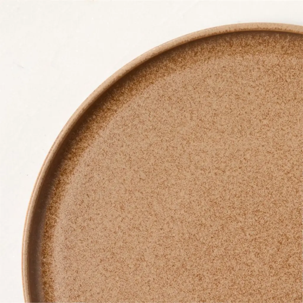 Expert craftsmanship leaves its mark on our best-selling Drift dinner plate. Pressed with a lipped edge, the round stoneware is finished by hand with a warm tan reactive glaze that behaves beautifully when kiln-fired. What surfaces is a subtle crackled texture that makes each piece unique. Part of the Drift tan dinnerware collection; also looks great with Drift dinnerware in green, ivory, dark blue and lilac. CB2 exclusive.