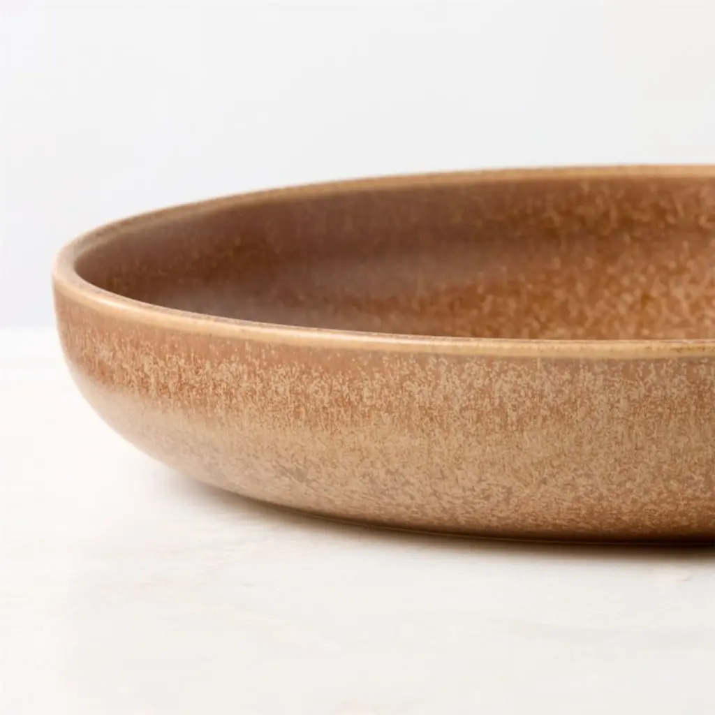 Expert craftsmanship leaves its mark on our best-selling Drift pasta bowl. Pressed with a lipped edge, the round stoneware is finished by hand with a warm tan reactive glaze that behaves beautifully when kiln-fired. What surfaces is a subtle crackled texture that makes each piece unique. Part of the Drift tan dinnerware collection; also looks great with Drift dinnerware in green, ivory, dark blue and lilac. CB2 exclusive.