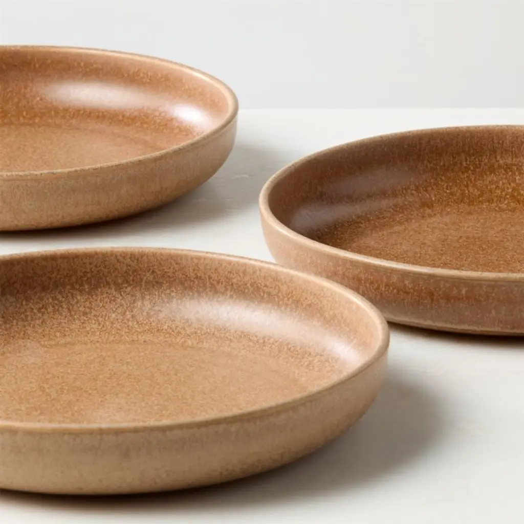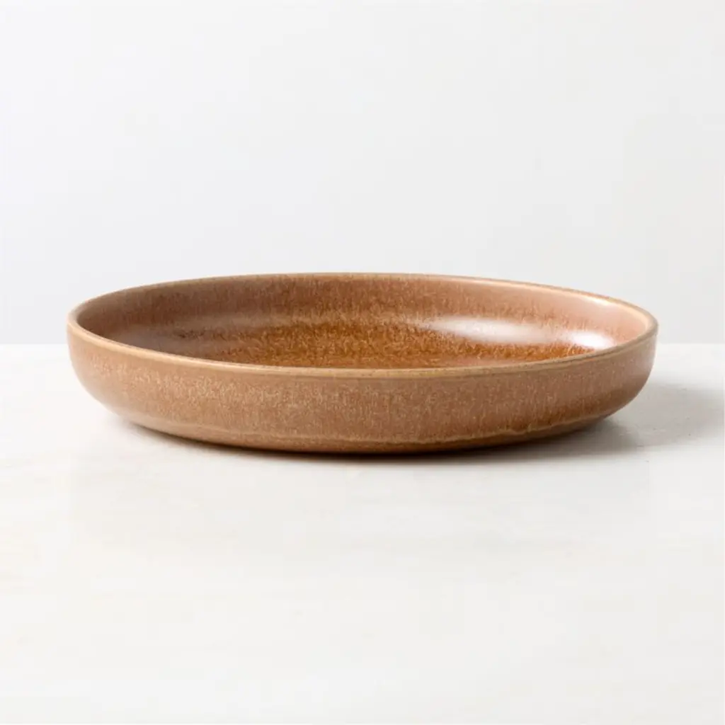 Expert craftsmanship leaves its mark on our best-selling Drift pasta bowl. Pressed with a lipped edge, the round stoneware is finished by hand with a warm tan reactive glaze that behaves beautifully when kiln-fired. What surfaces is a subtle crackled texture that makes each piece unique. Part of the Drift tan dinnerware collection; also looks great with Drift dinnerware in green, ivory, dark blue and lilac. CB2 exclusive.