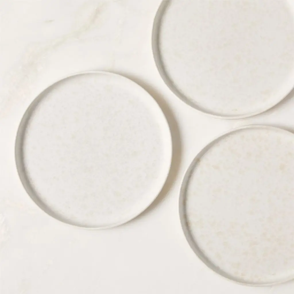 Expert craftsmanship leaves its mark on the Drift Salad Plate. Hand-pressed with a lipped edge, round stoneware form is coated with a matte ivory water-reactive glaze that behaves beautifully when kiln-fired. What surfaces is a subtle crackled texture in a rich tonal mix that makes each piece unique. Part of the Drift Reactive Ivory Dinnerware collection; also looks great with Drift Dinnerware in both lavender and green. CB2 exclusive.