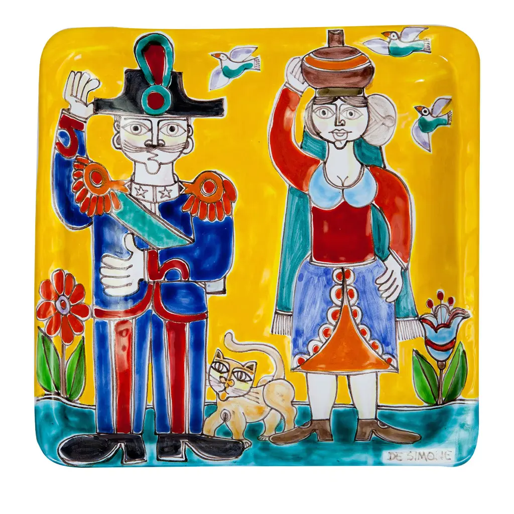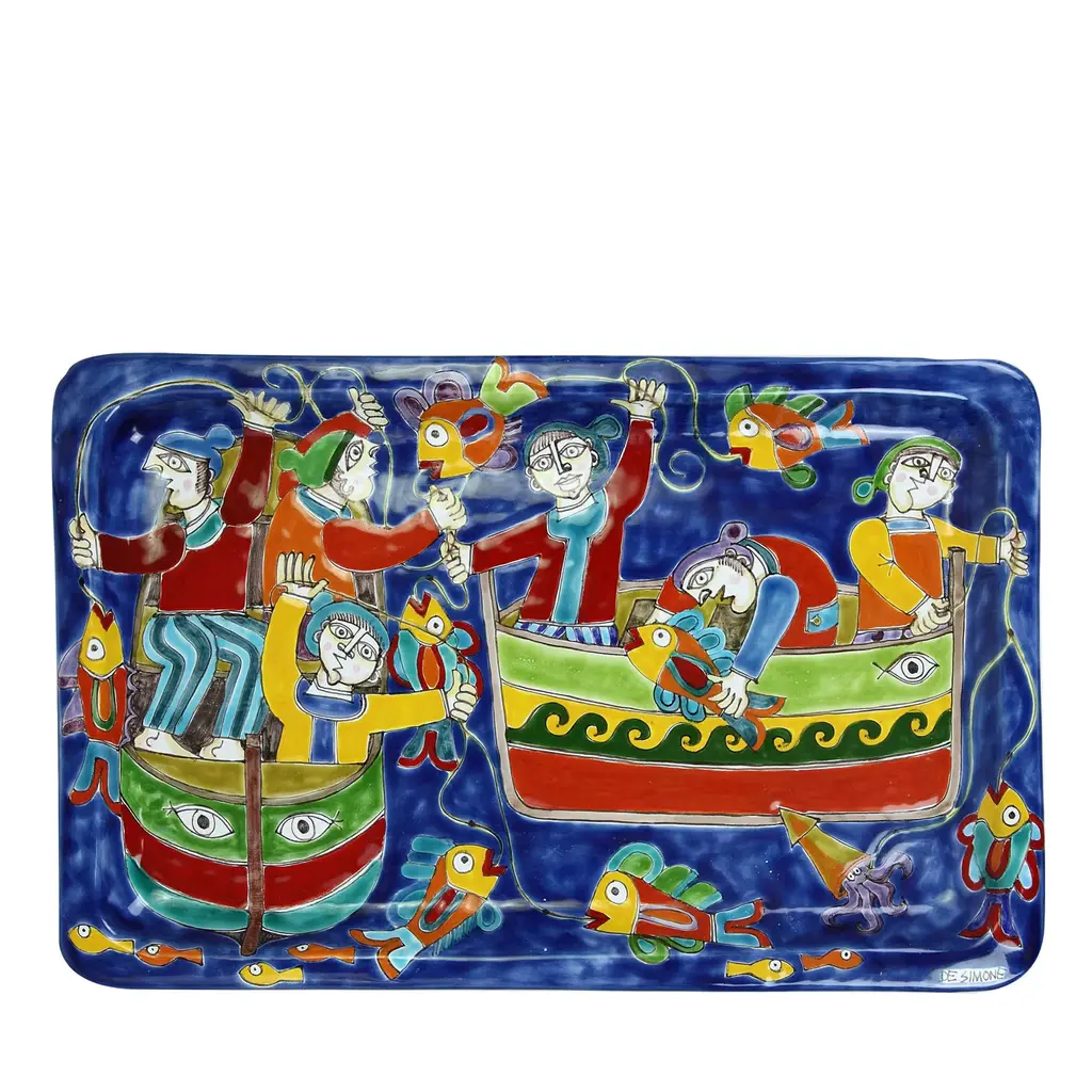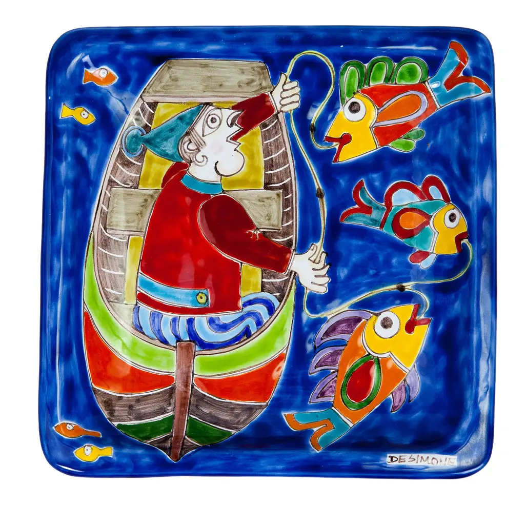 This ornamental plate was handcrafted and painted by in-house artisans, making each plate slightly unique. The item is a colorful depiction of two fishermen in a rowboat capturing a school of three brightly colored fish. It can also be hung on a wall, due to a hole on its back. The DS line is the brand's signature collection.