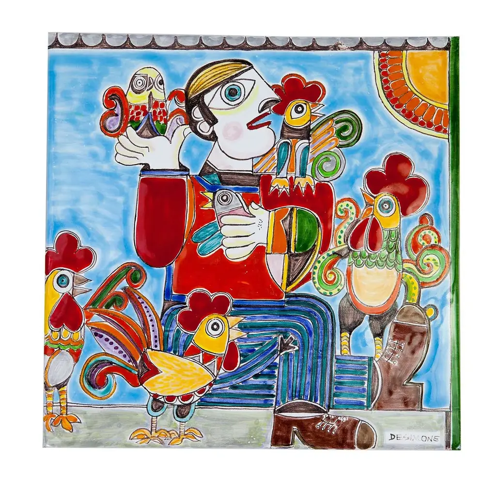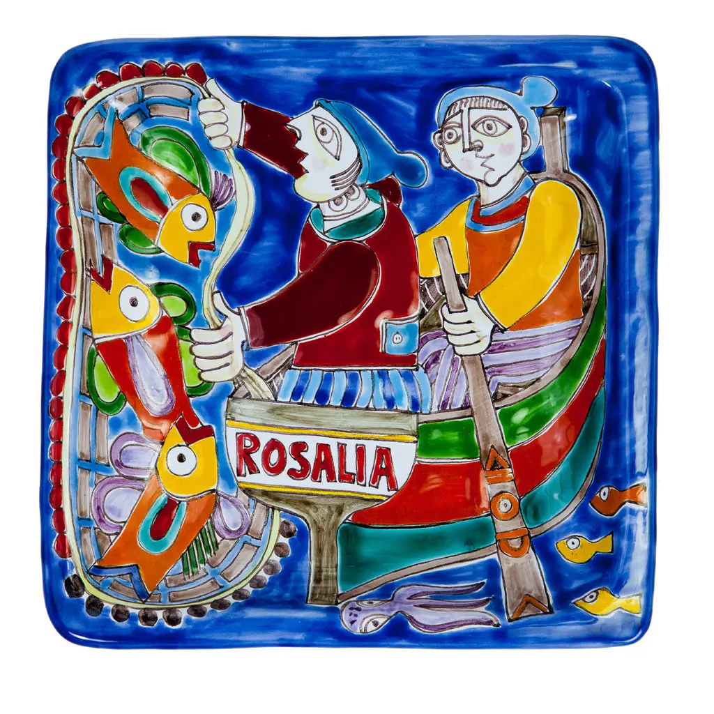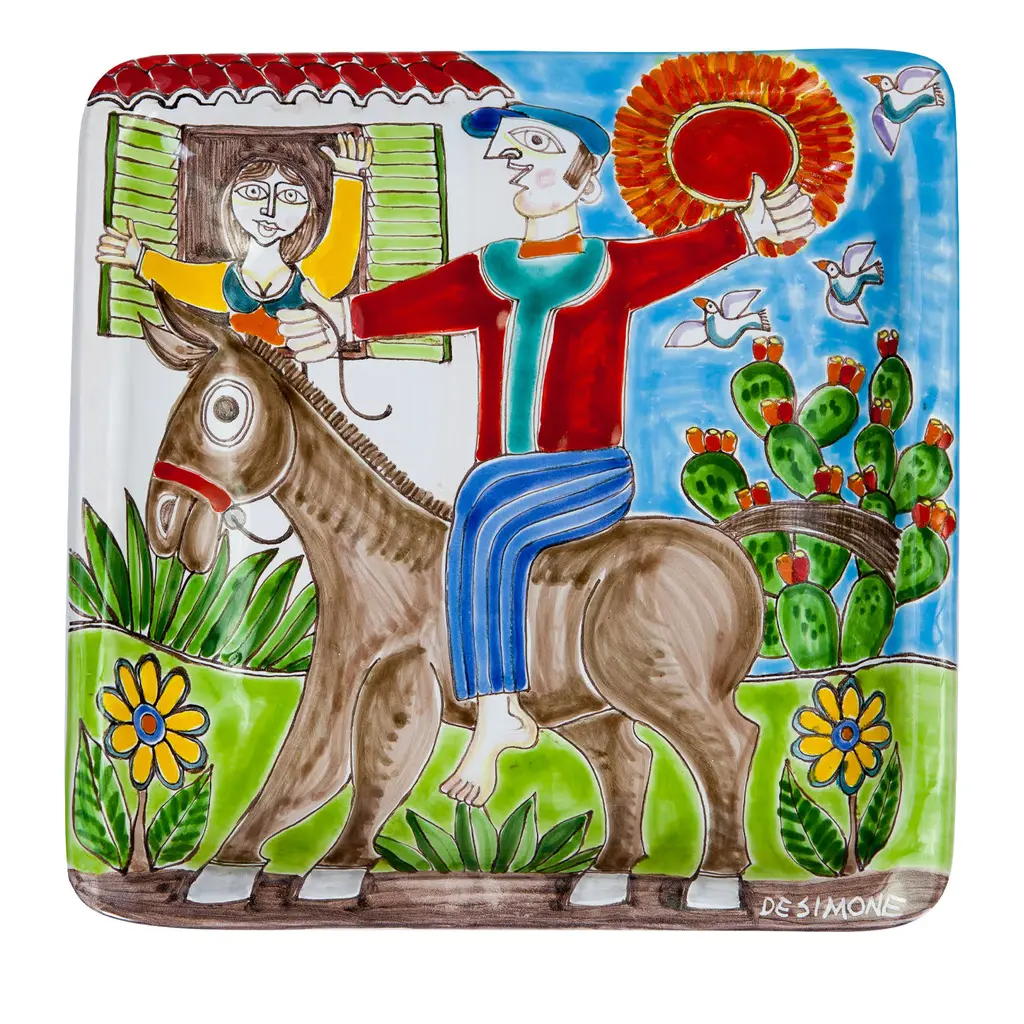 A young man serenades his beloved under the moonlight, as she listens from her window to the romantic sounds of his concertina. This charming scene is illustrated on this handmade and painted ornamental plate from the brand's signature DS collection, which depicts scenes from traditional, historical Sicilian life. Handmade and painted in Palermo, Italy.