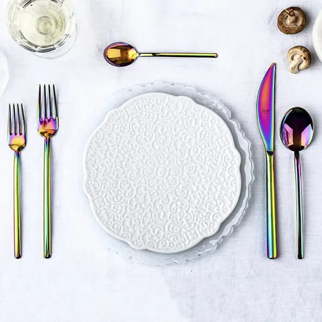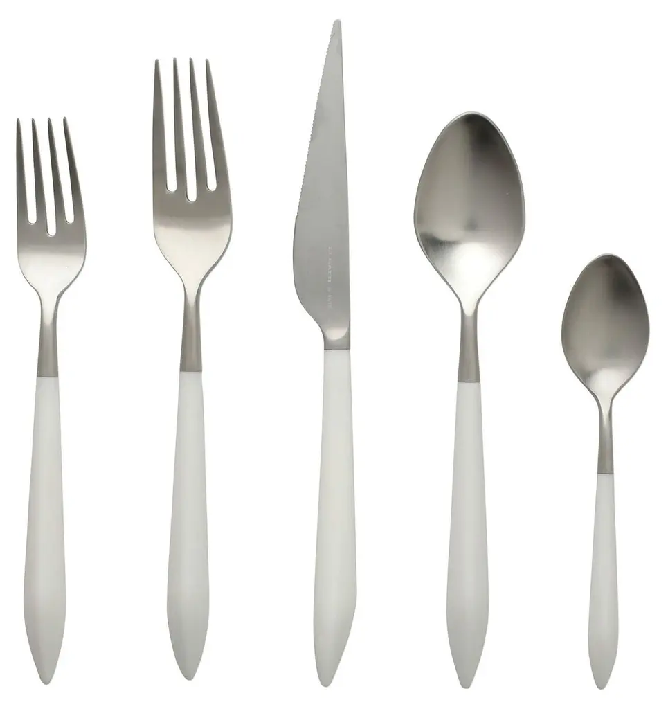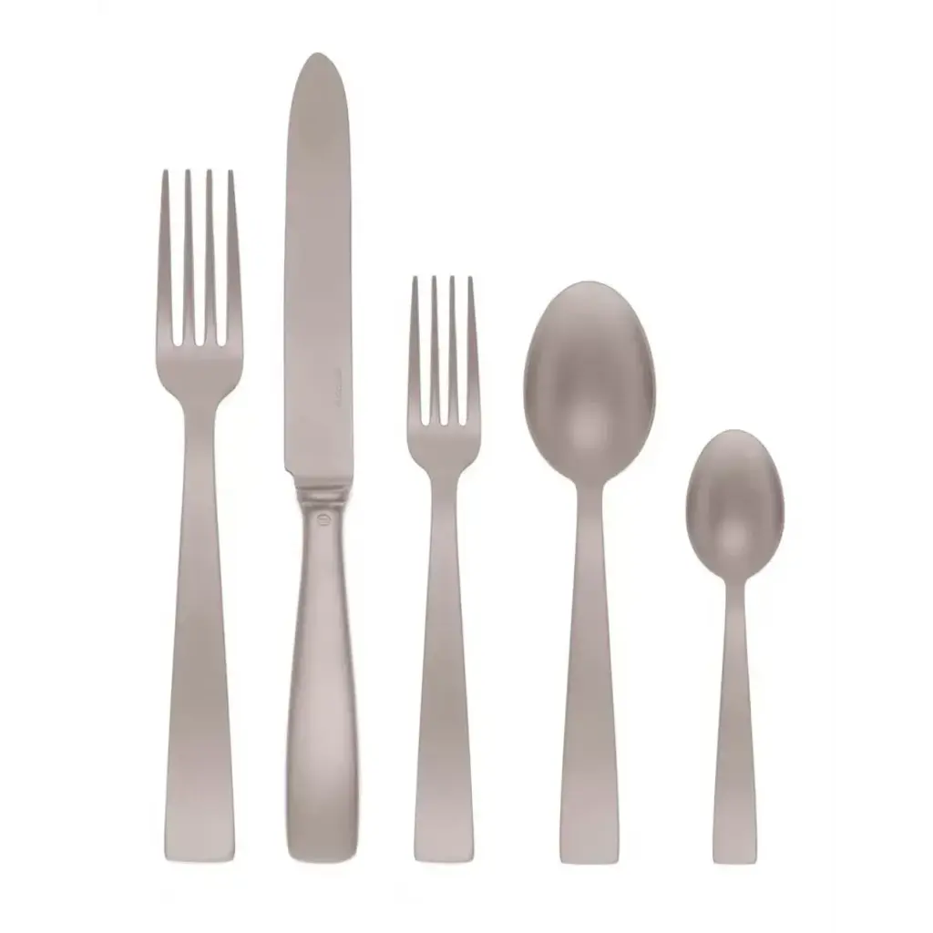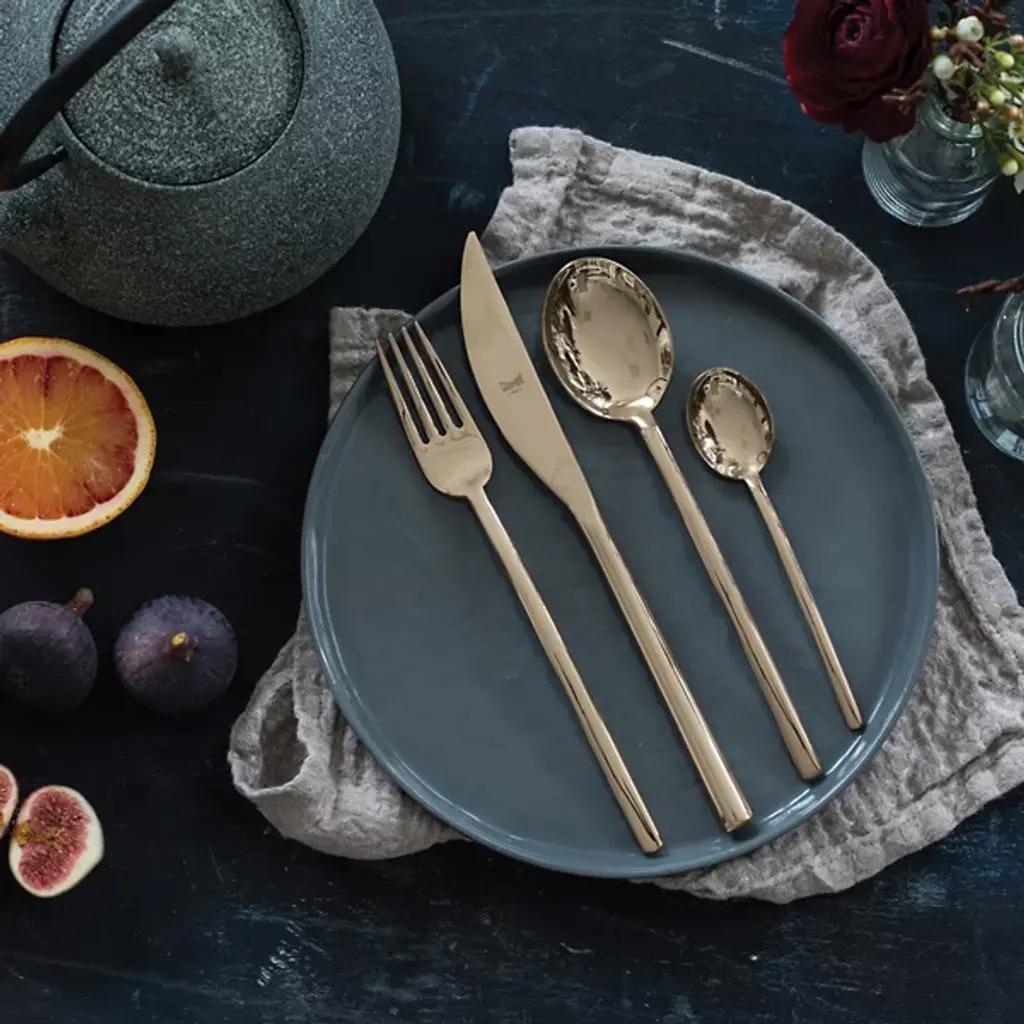 The Due 5-Piece Flatware Place Setting from Mepra is a splendid addition to any dining room, embodying a Luxury/Glam style. This set proudly features 18/10 stainless steel coated with a resilient PVD finish for lasting durability. Crafted in Italy, it combines elegance with practicality, as it is dishwasher safe and hygienic. This cutlery set's sophisticated design complements any fine-dining setting, making it an essential piece for those who appreciate luxury in their dining experience.