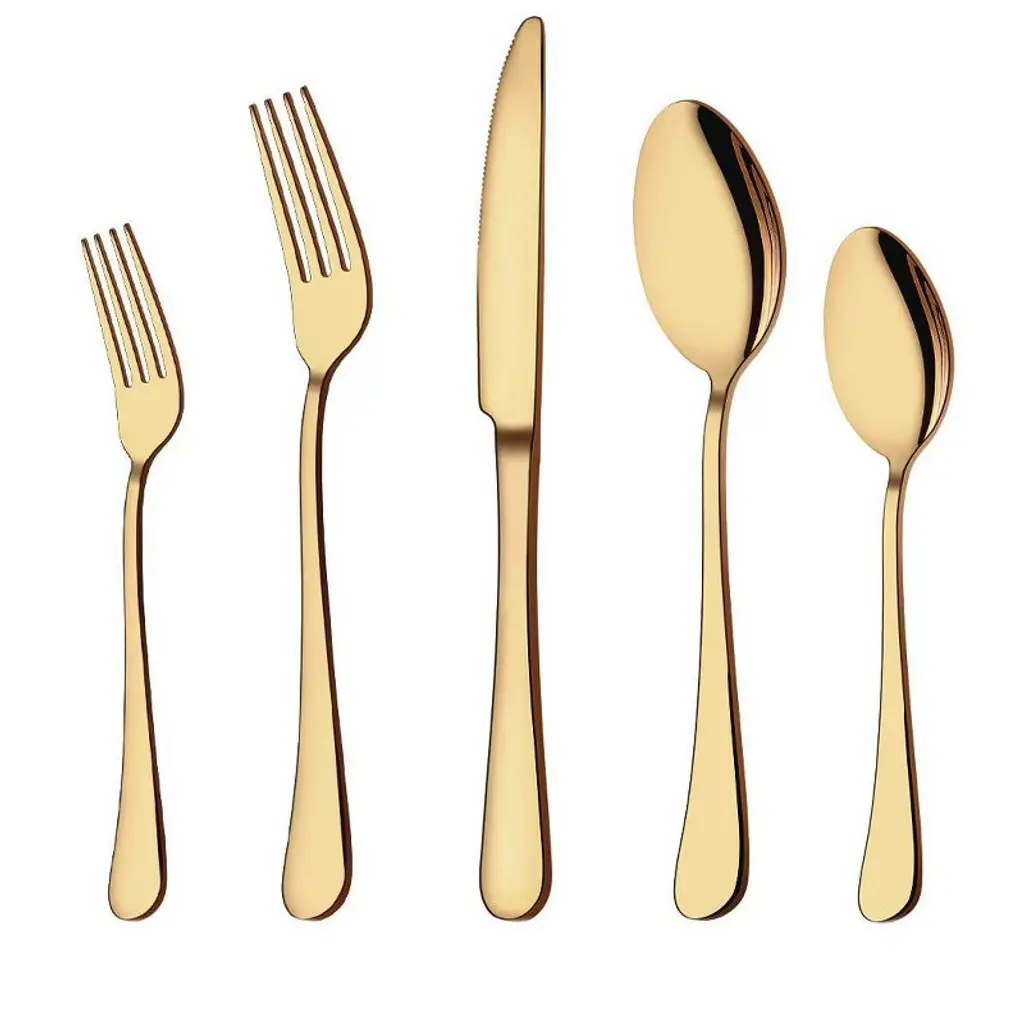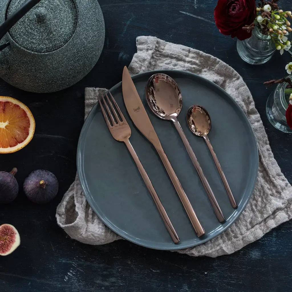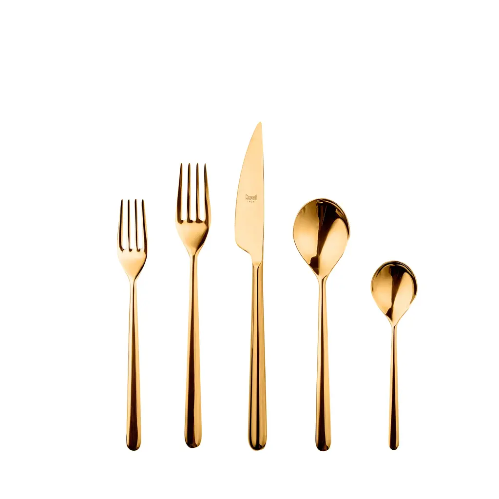 Marked by modern and elegant lines, this brushed bronze stainless steel set is part of the Due Collection available in other finish and with silver plating. This set can be personalized with an engraved logo and includes 5 pieces whose surface is protected by a titanium-based coating applied with the innovative PVD technique. Dimensions as follows: table fork (20 cm), table knife (22.5 cm), dessert spoon (17.5 cm), dessert fork (18 cm), and coffee spoon (13.5 cm).
