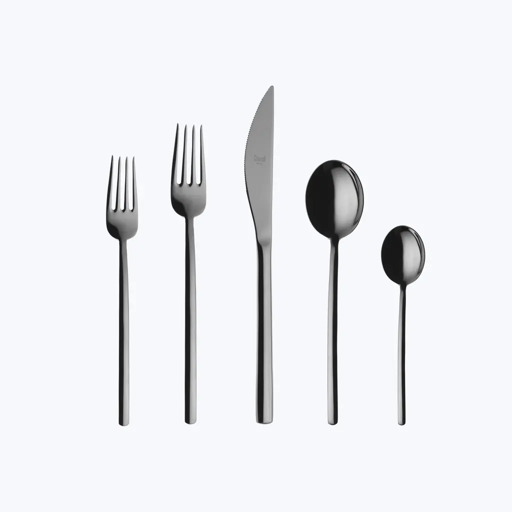 The Due Flatware Set is made of the highest quality 18/10 steel, 4 mm thick, very durable, and incredibly ergonomic for dinner parties and everyday use. Knives have double serration for durable sharpness. Enhance your dining experience with this beautiful Italian flatware! Dishwasher and food safe. Created in 1947, Mepra is a family-owned and operated company with a worldwide presence in flatware, cookware, and stainless-steel products. Today, Mepra flatware and kitchenware appear on the tables of the most prestigious hotels, award-winning restaurants, and artisanal-centered homes. Bring the magic of three generations worth of Italian traditions, designs, and lifestyles into your kitchen and dining room today. Stainless Steel plating features a special vintage process that gives it a rustic, warm, and elegant appearance while still being durable and inoxidizable coating. Winners of the 2020 Good Design Award, the Bronzo, Rainbow, Champagne, Oro Nero, Oro, and Ice Oro Collections are perfect for the most refined and stylish homes with their pure lines and harmoniously light forms. Champagne Ice, Ice Bronze, Ice, Ice Oro Nero, and Rainbow Ice are coated with a PVD Titanium Coating that is tested and guaranteed for more than 3000 washes in a commercial dishwasher. The special Titanium Plating was originally developed by NASA, resulting in a durable and inoxidizable coating like non-other. 20 Piece Cutlery Set includes (4) Dinner Forks, (4) Dinner Knives, (4) Salad Forks, (4) Soup Spoons, and (4) Coffee/Teaspoons