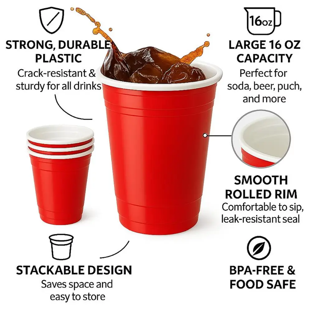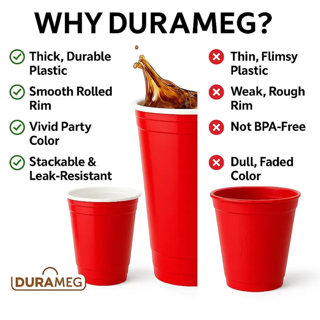 🧋 【100 PACK RED CUPS】 16 oz red cups - Our vibrant and bold red plastic disposable cups in 16 oz size add a pop of color to any beverage. With their opaque design, our red cups make a statement and add fun to your drinks, letting the flavors and aromas shine. ✅ Impactful serving: 16 oz. Red plastic cold cups make a bold statement at your bar or catered event. These cups create a striking presentation for your refreshing drinks and cocktails and are perfect for serving smoothies, milkshakes, iced tea, and sodas at your eatery. Their versatility makes them ideal for fruit salads, desserts, or appetizers. 💪 【STURDY & REINFORCED】 High-quality 16oz red plastic cups made of durable PS material. These cups are BPA-free, non-liquid absorbing, and easy to clean for reuse. Their opaque design ensures no flavor or aroma is compromised, and they remain odorless, perfect for enjoying your favorite drinks, from rich coffee to bold cocktails. ✅ Practically unbreakable: Crafted from ultra-durable PS plastic, these red cups are engineered to withstand the rigors of use, resisting cracks and breaks in guests' hands. Say goodbye to customer complaints and worries about shattered cups and hello to a stress-free experience. Plus, our PS material is recyclable, reducing waste and promoting sustainability. 👍 【EASY TO SIP & HOLD】 Red plastic cups with a rolled rim for added rigidity and a comfortable sipping experience. Slimmer bottom for easy grip and fit in cupholders. Compatible with various lids. ✅ Showstopping color: These red cups add a bold and eye-catching touch to your beverages, perfect for impulse sales. 🚊 【TO GO & TRAVEL-FRIENDLY】 16-ounce red plastic cups, disposable and suitable for single or multi-use. Ideal for parties, events, and takeout. ✅ Grab n Go…: Use these cups for conveniently packaging snacks like parfaits, salads, and yogurts.🥤 【COLD DRINK MULTI USE】 Red plastic cups for various cold drinks, such as water, beer, cocktails, smoothies, and more!✅ Rolled Rim: Ensures a comfortable drinking experience and secure fit with compatible lids for on-the-go applications. Compatible with standard lid sizes for easy serving. Durameg red plastic cups offer durability, functionality, and quality at an economical price, suitable for various businesses. Durameg 16 oz Red Plastic Cups – 100 Count Durameg 16 oz red plastic cups deliver a dependable and versatile solution for serving cold beverages in various settings. Crafted from durable plastic, these cups are built to withstand regular use while maintaining their form and function. The bold red color adds a classic, festive appearance, while the ergonomic shape ensures a secure and comfortable grip. Ideal for serving soda, iced tea, juice, or other cold drinks, these disposable cups are suitable for home use, parties, events, or commercial environments. Each pack includes 100 single-use cups for easy cleanup and efficient beverage service.